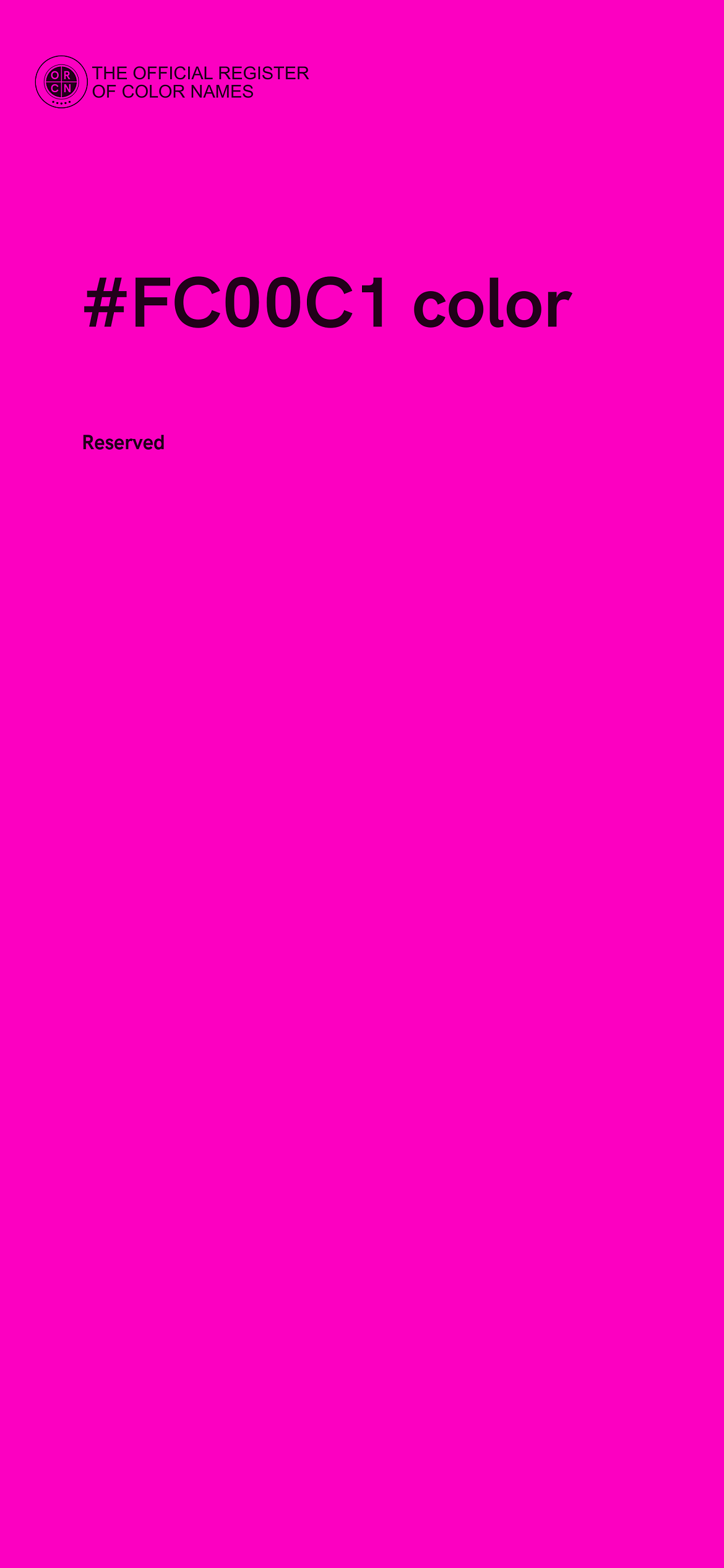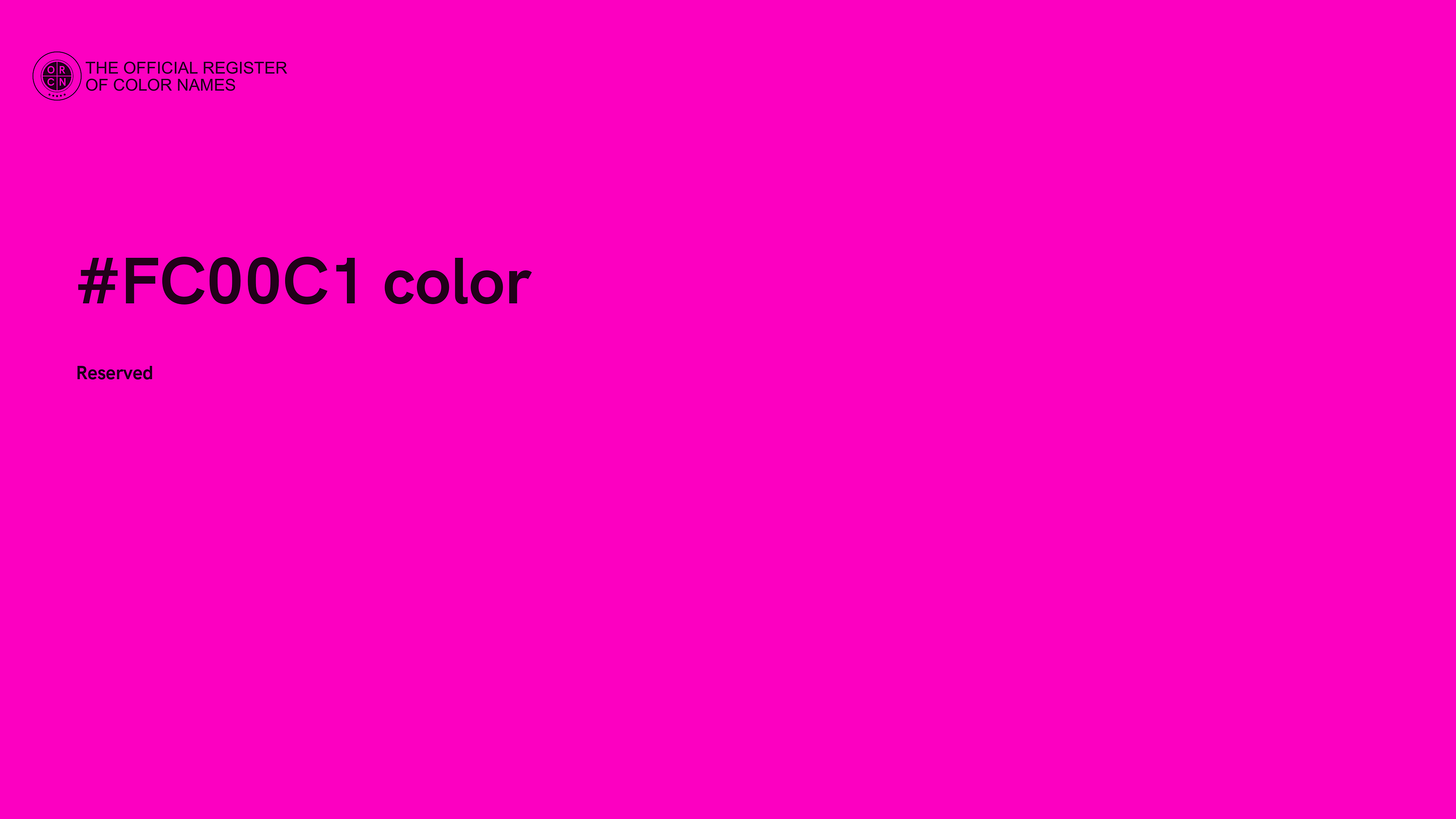 The digital color HEX #FC00C1 belongs to the Magenta Color Family featuring Full Saturation (Saturation Family) and Light (Brightness Family).