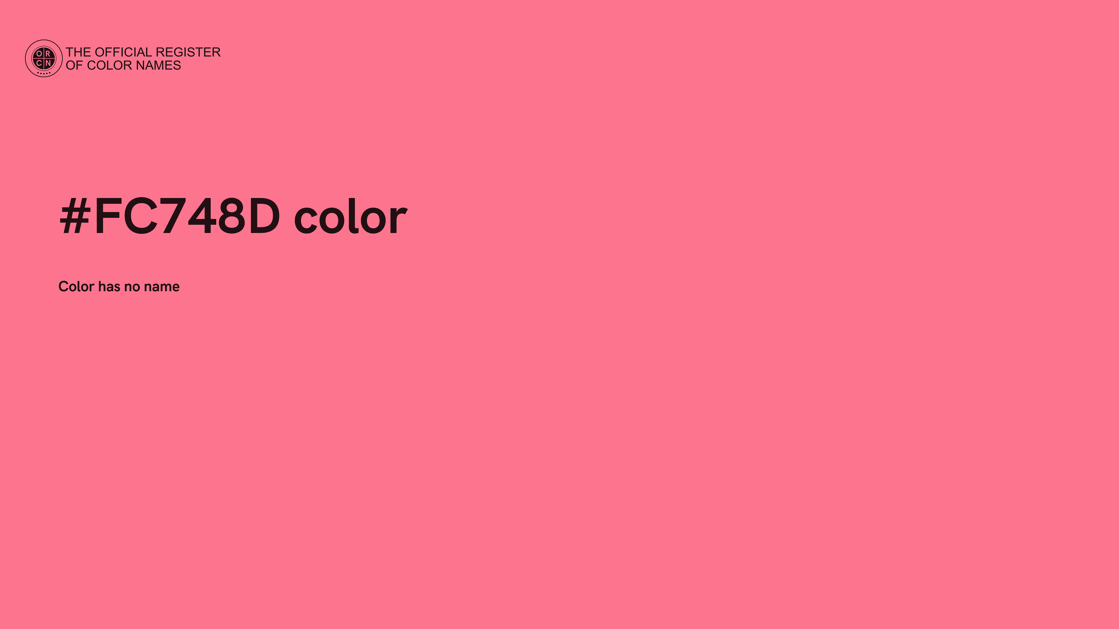 The digital color HEX #FC748D belongs to the Red Color Family featuring Full Saturation (Saturation Family) and Very Light (Brightness Family).