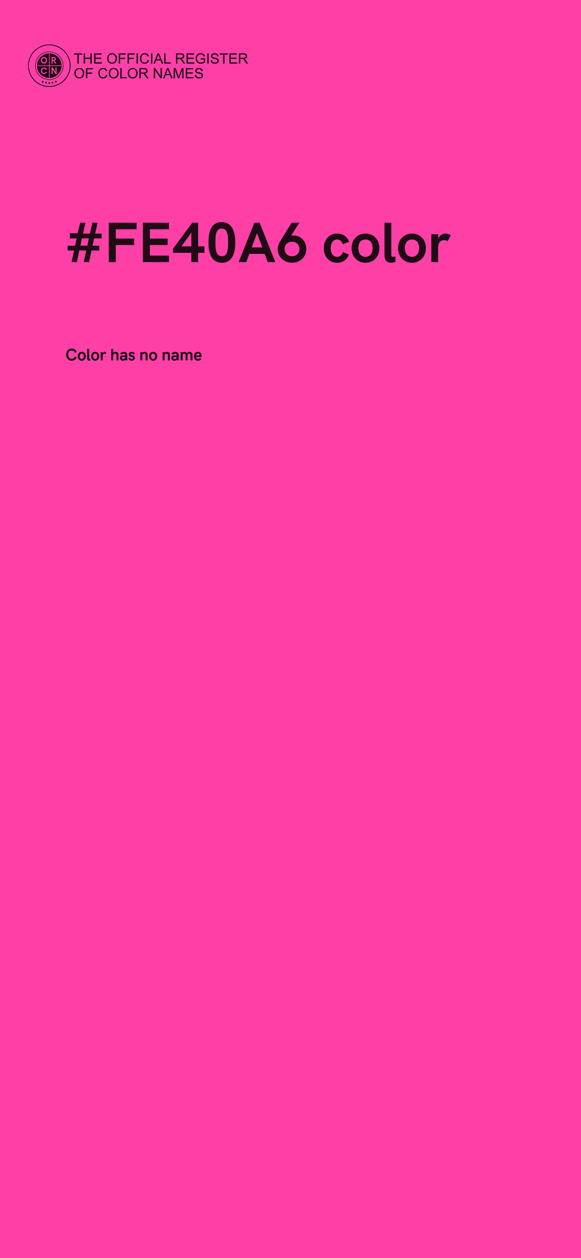 The digital color HEX #FE40A6 belongs to the Rose Color Family featuring Full Saturation (Saturation Family) and Very Light (Brightness Family).