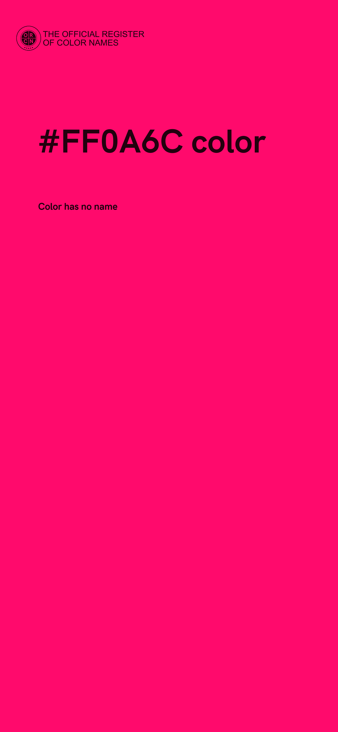 The digital color HEX #FF0A6C belongs to the Rose Color Family featuring Full Saturation (Saturation Family) and Light (Brightness Family).