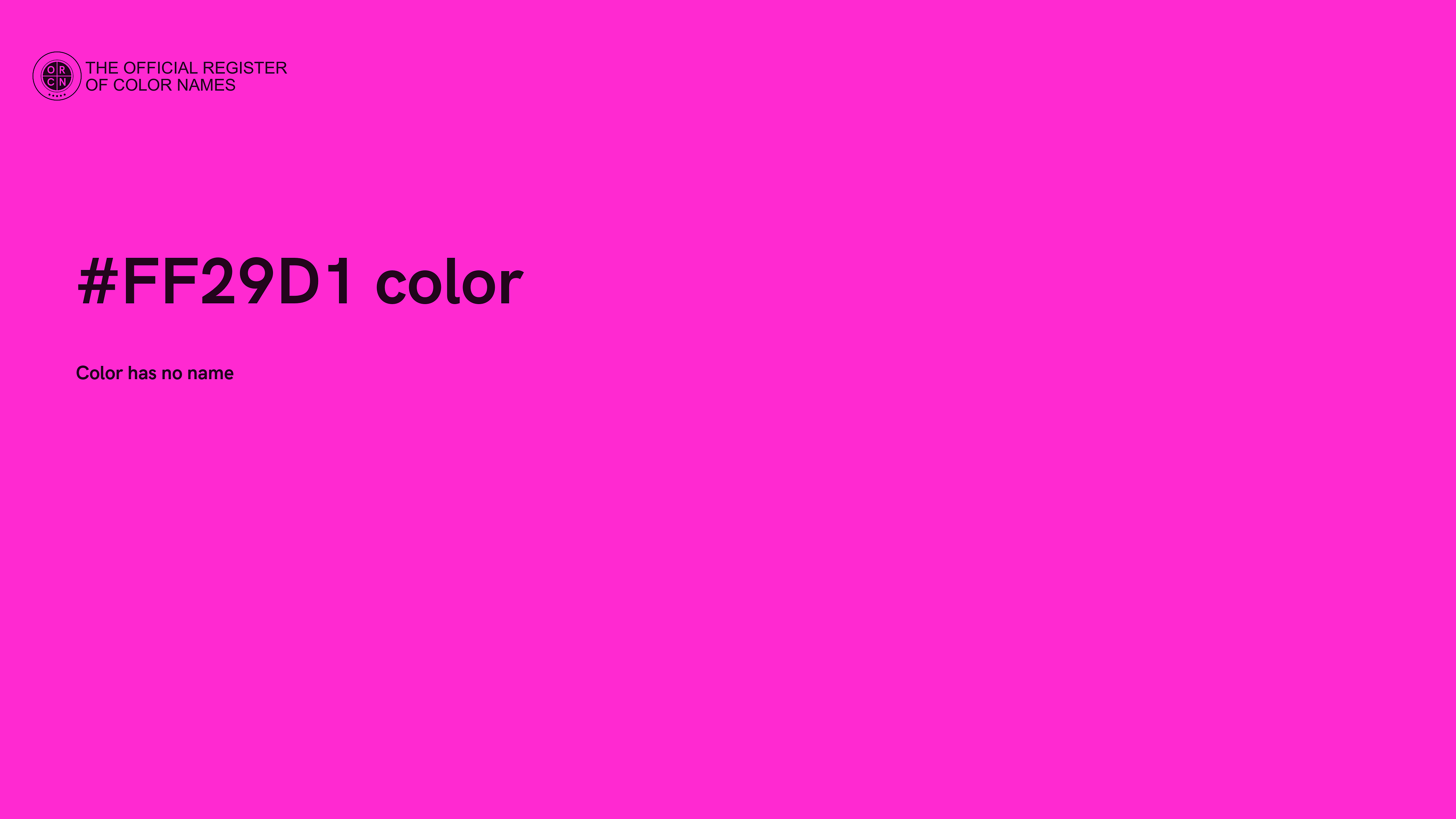 HEX code #FF29D1 represent the color in hexadecimal format by combining three values – the amounts of Red, Green and Blue (RGB). Its RGB composition is 255, 41, 209 ( rgb(255, 41, 209) ), which breaks down into 100% of Red, 16.1% Green and 82% Blue.