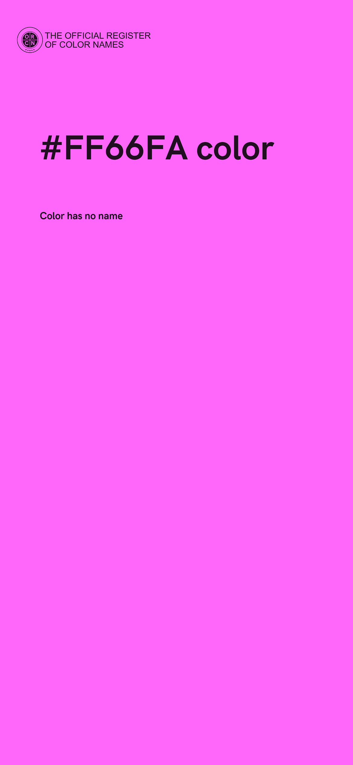 The digital color HEX #FF66FA belongs to the Magenta Color Family featuring Full Saturation (Saturation Family) and Very Light (Brightness Family).