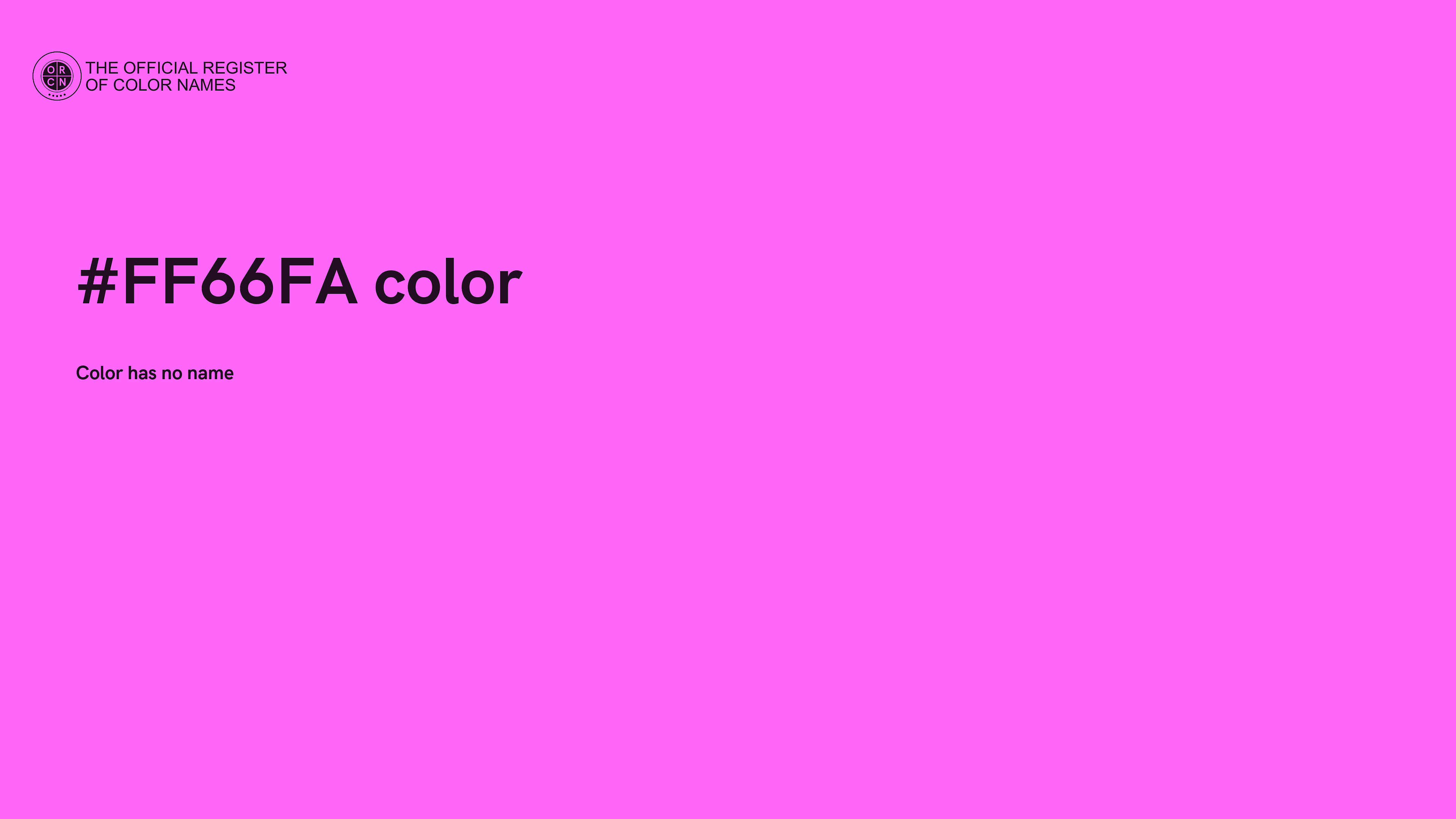 HEX code #FF66FA represent the color in hexadecimal format by combining three values – the amounts of Red, Green and Blue (RGB). Its RGB composition is 255, 102, 250 ( rgb(255, 102, 250) ), which breaks down into 100% of Red, 40% Green and 98% Blue.