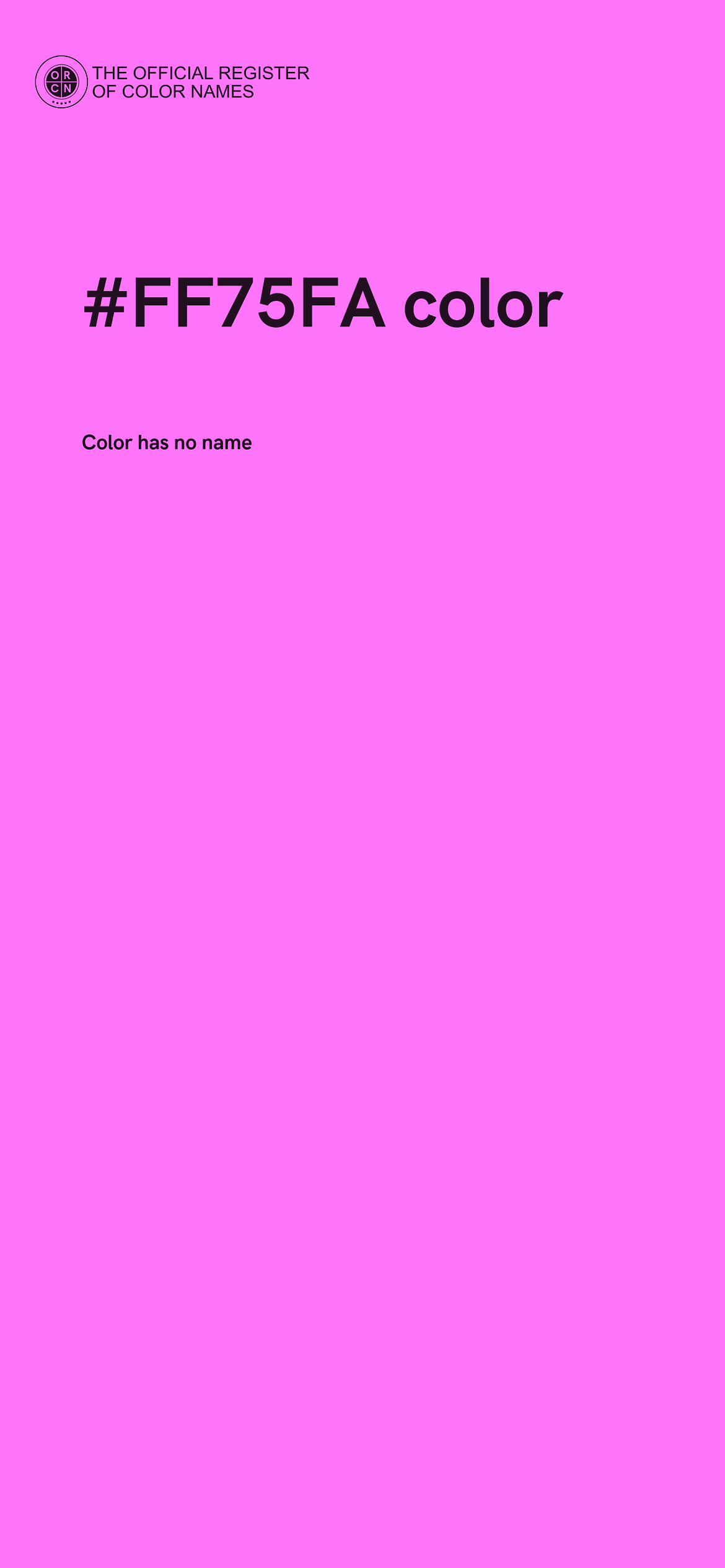 For printing in non digital world, #FF75FA is represented in CMYK as 0 Cyan, 54 Magenta, 2 Yellow, and 0 Black (Key) (C:0 M:54 Y:2 K:0).