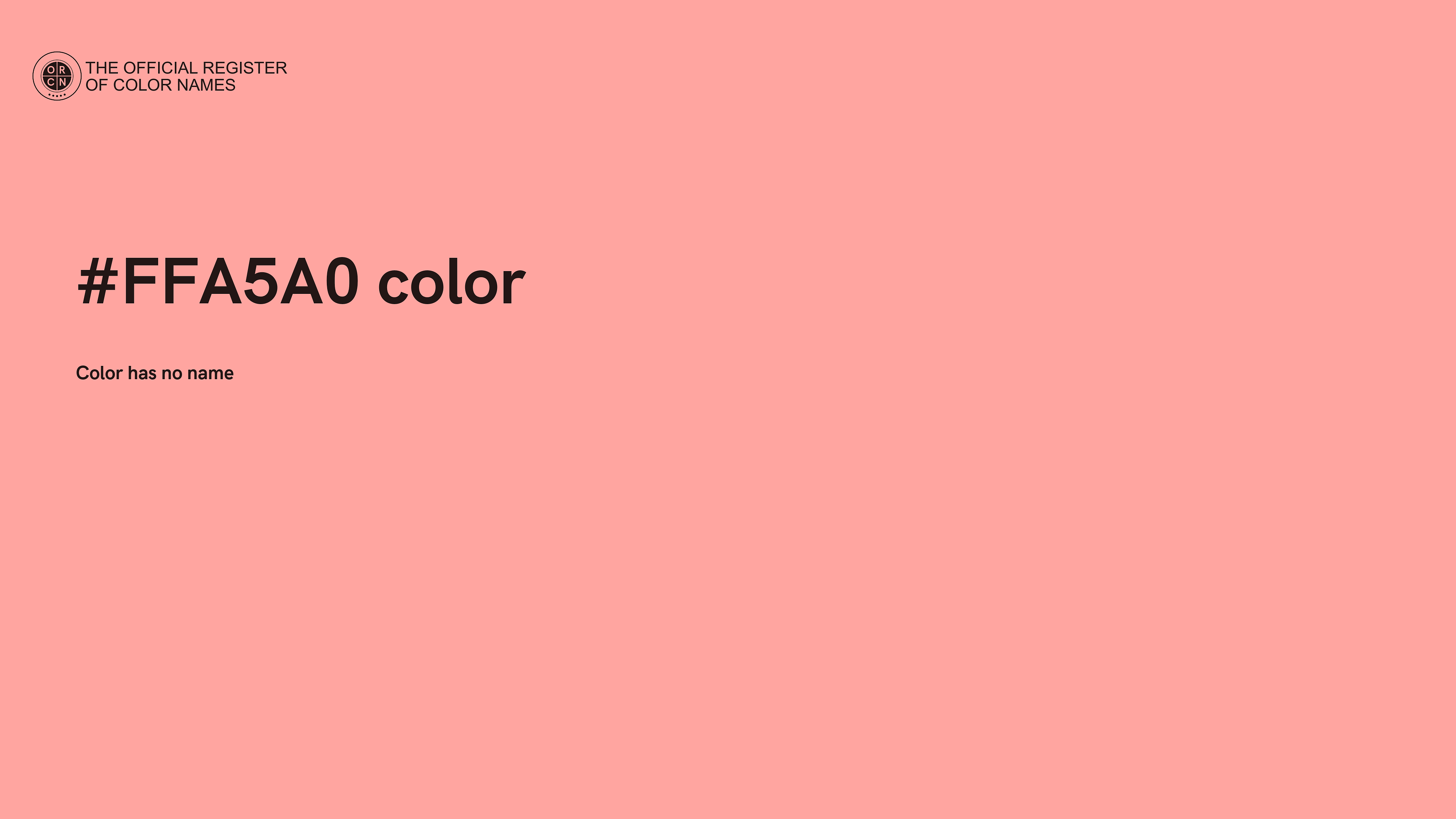 The digital color HEX #FFA5A0 belongs to the Red Color Family featuring Full Saturation (Saturation Family) and Very Light (Brightness Family).