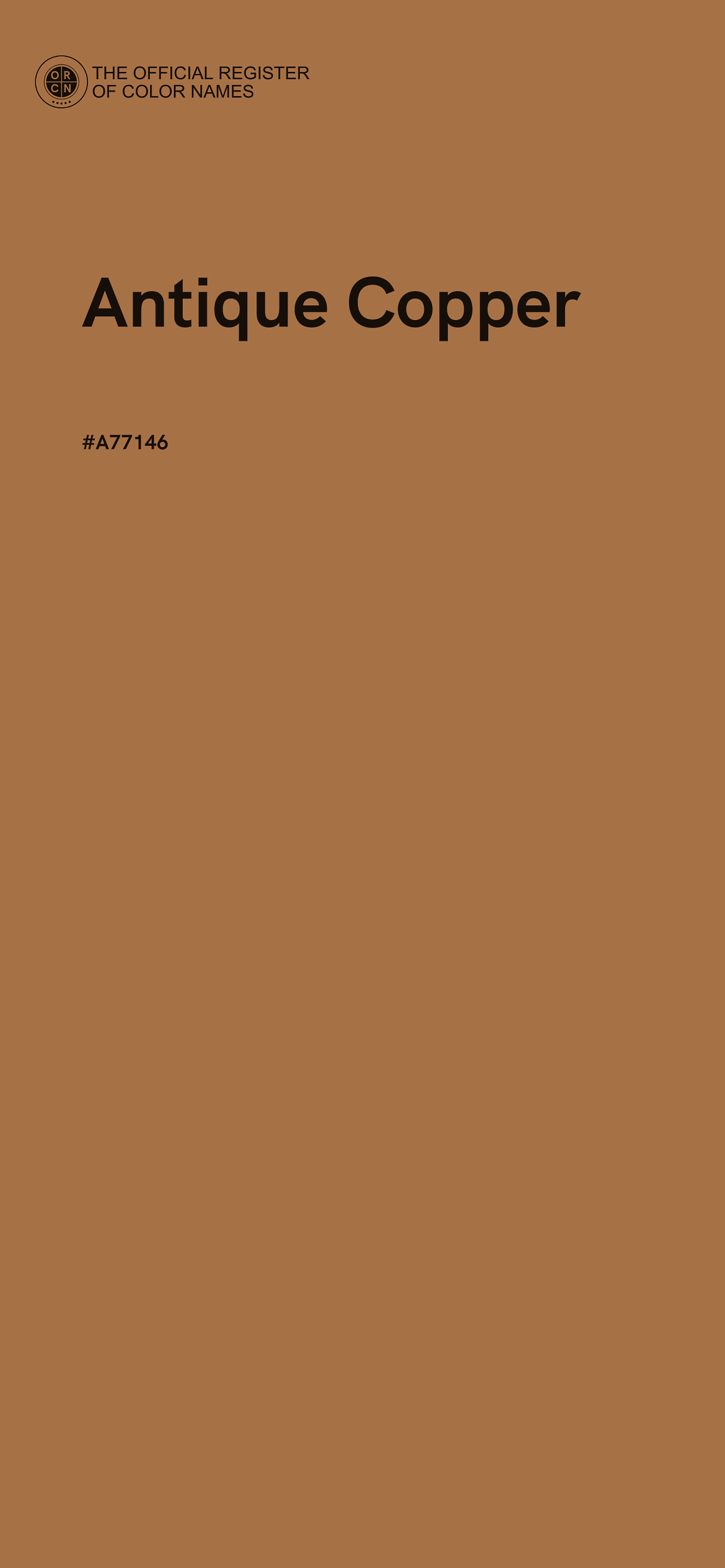 The digital color HEX #A77146, known as "Antique Copper", belongs to the Orange Color Family featuring Moderate Saturation (Saturation Family) and Light (Brightness Family).