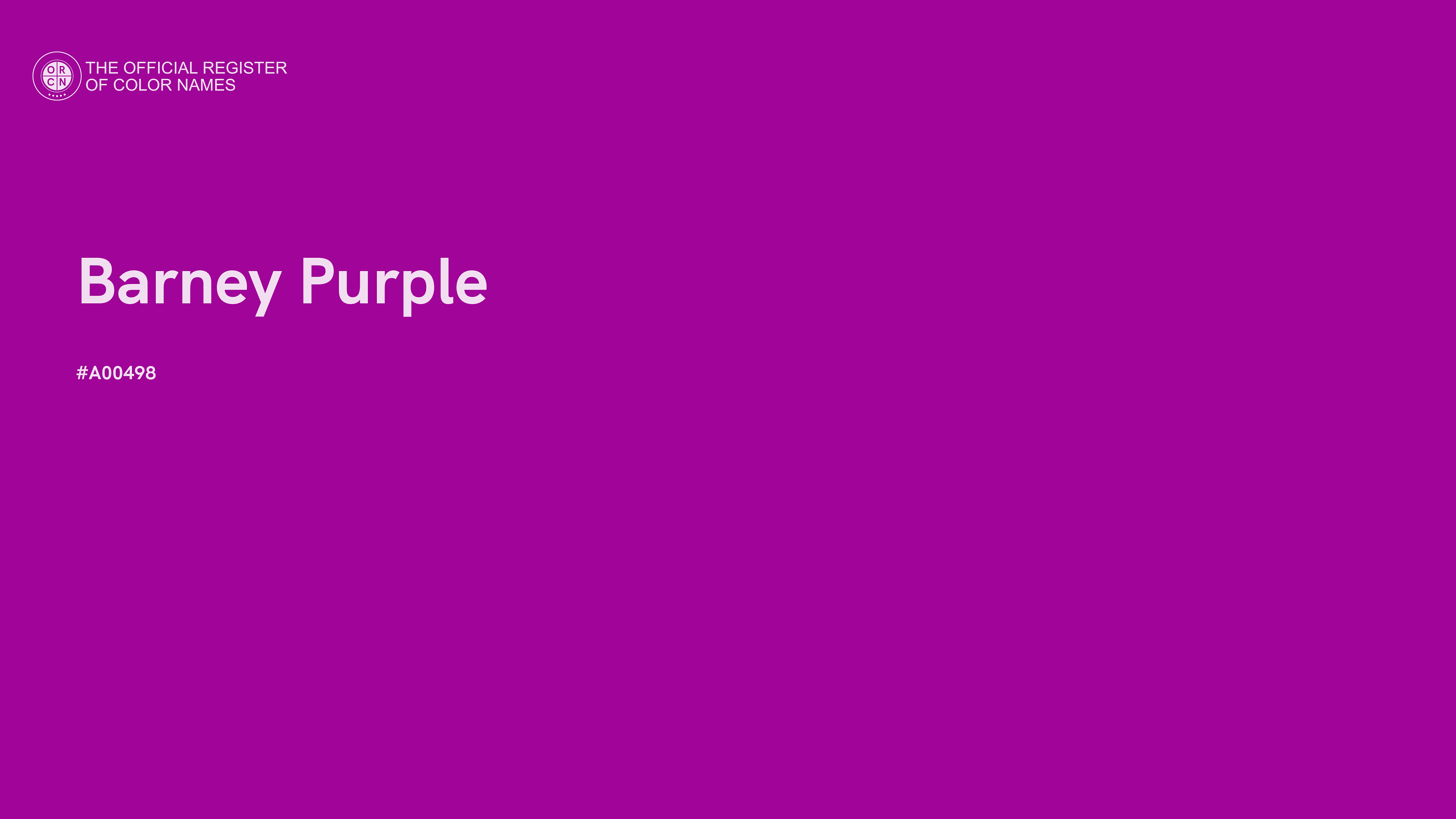 The digital color HEX #A00498, known as "Barney Purple", belongs to the Magenta Color Family featuring Full Saturation (Saturation Family) and Neutral (Brightness Family).