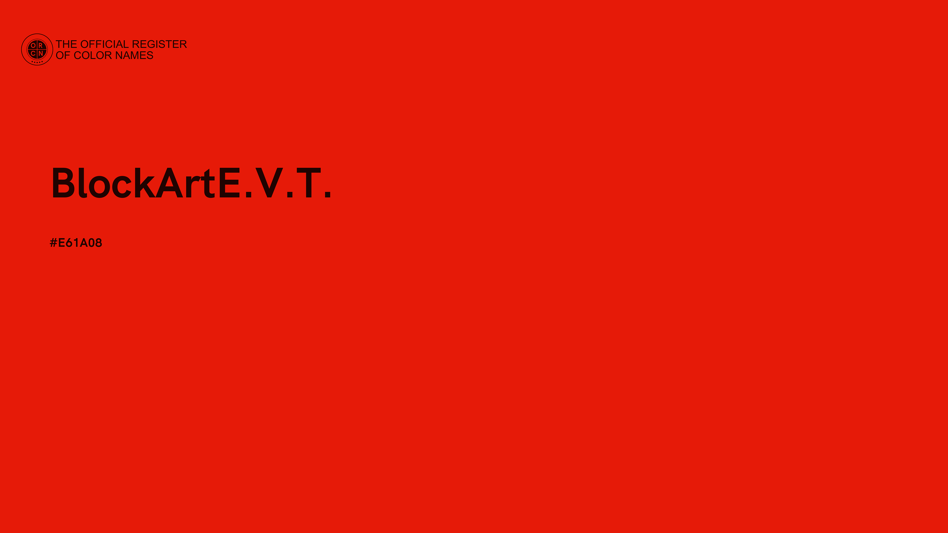 The digital color HEX #E61A08, known as "BlockArtE.V.T.", belongs to the Red Color Family featuring Full Saturation (Saturation Family) and Light (Brightness Family).