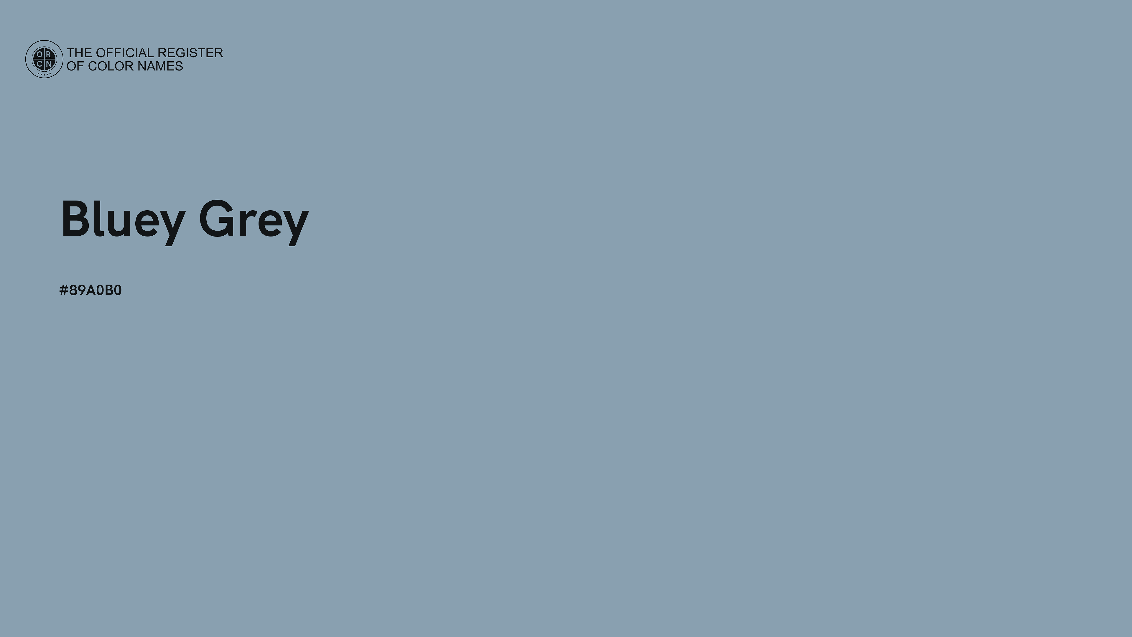 The digital color HEX #89A0B0, known as "Bluey Grey", belongs to the Azure Color Family featuring Low Saturation (Saturation Family) and Very Light (Brightness Family).