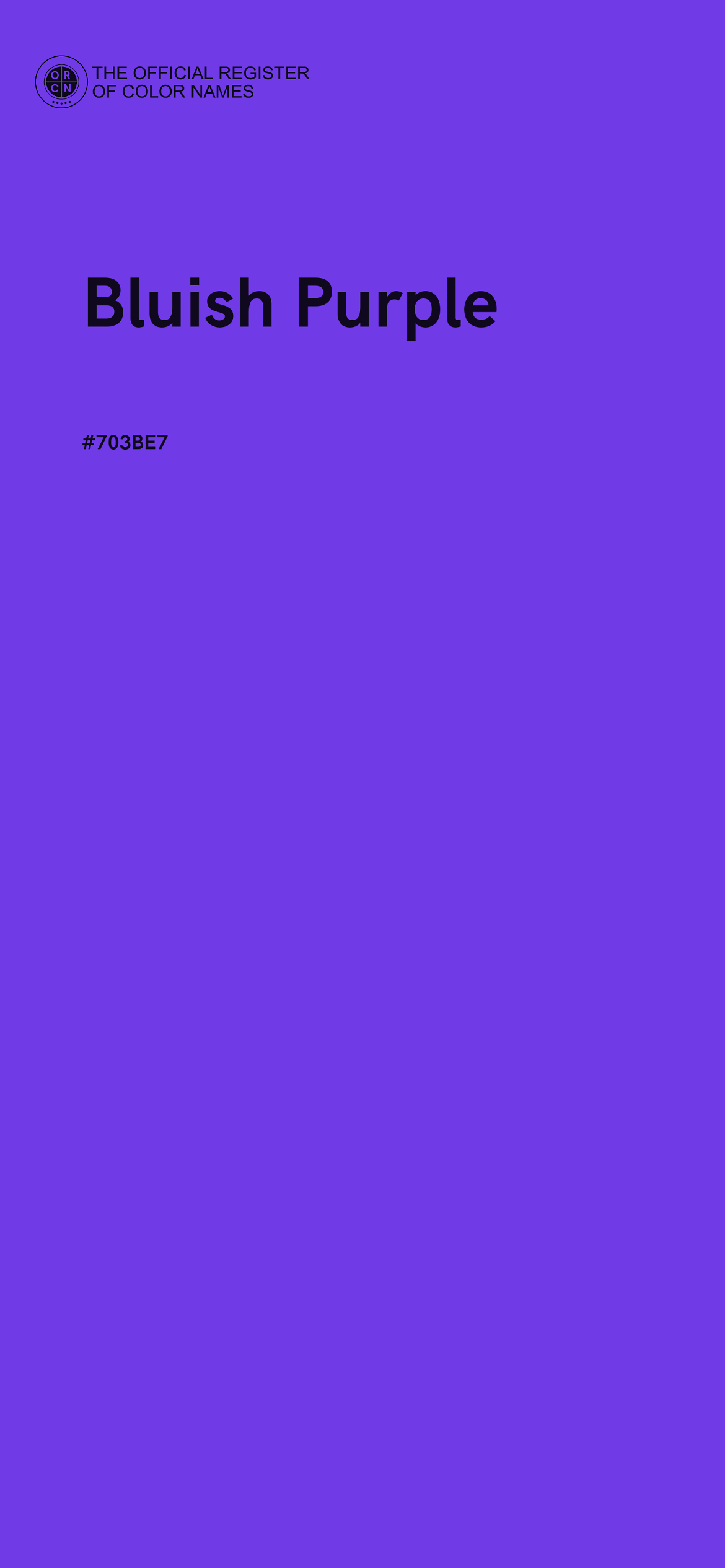 The digital color HEX #703BE7, known as "Bluish Purple", belongs to the Violet Color Family featuring High Saturation (Saturation Family) and Light (Brightness Family).