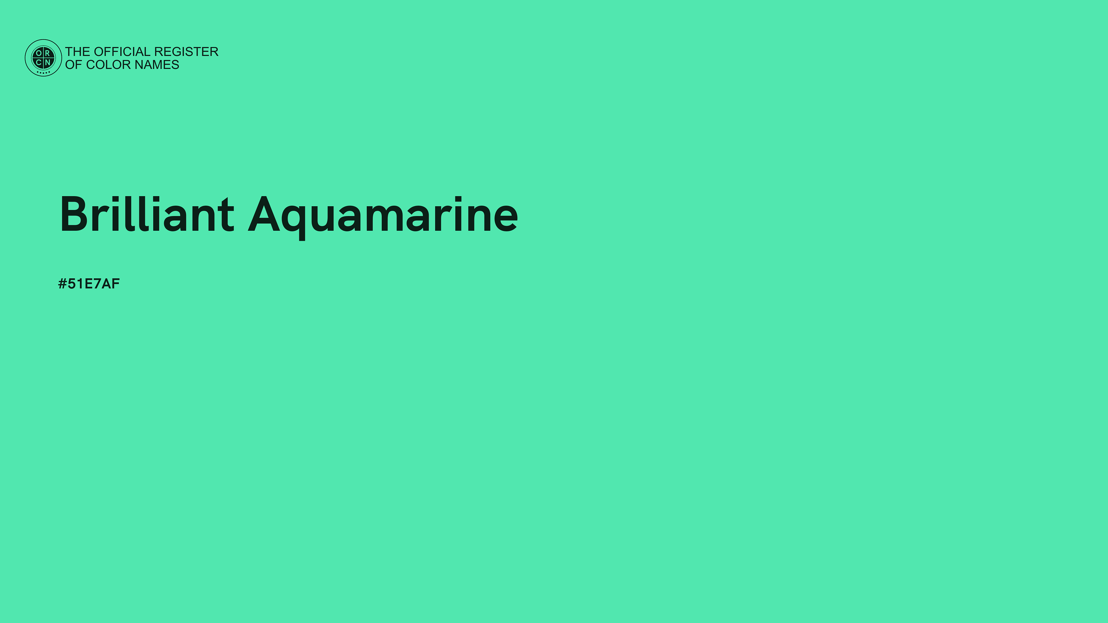 The digital color HEX #51E7AF, known as "Brilliant Aquamarine", belongs to the Spring Green Color Family featuring High Saturation (Saturation Family) and Very Light (Brightness Family).