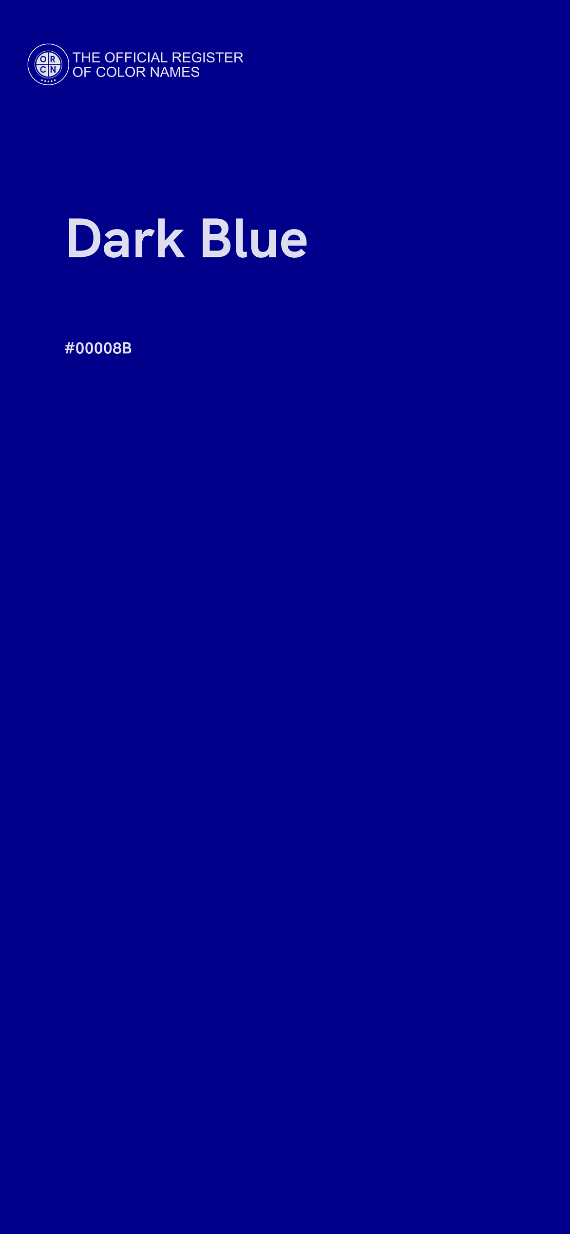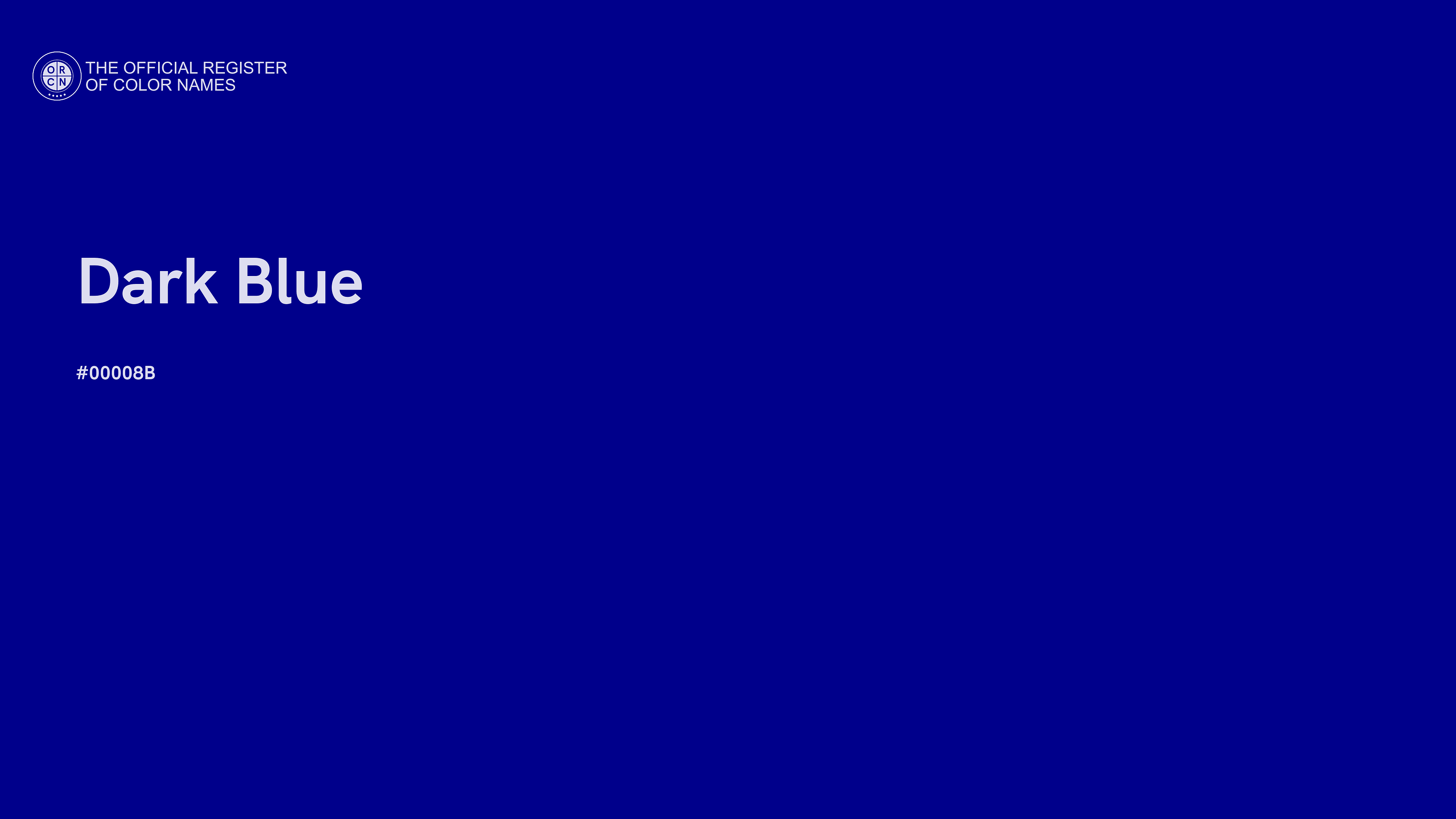 The digital color HEX #00008B, known as "Dark Blue", belongs to the Blue Color Family featuring Full Saturation (Saturation Family) and Neutral (Brightness Family).