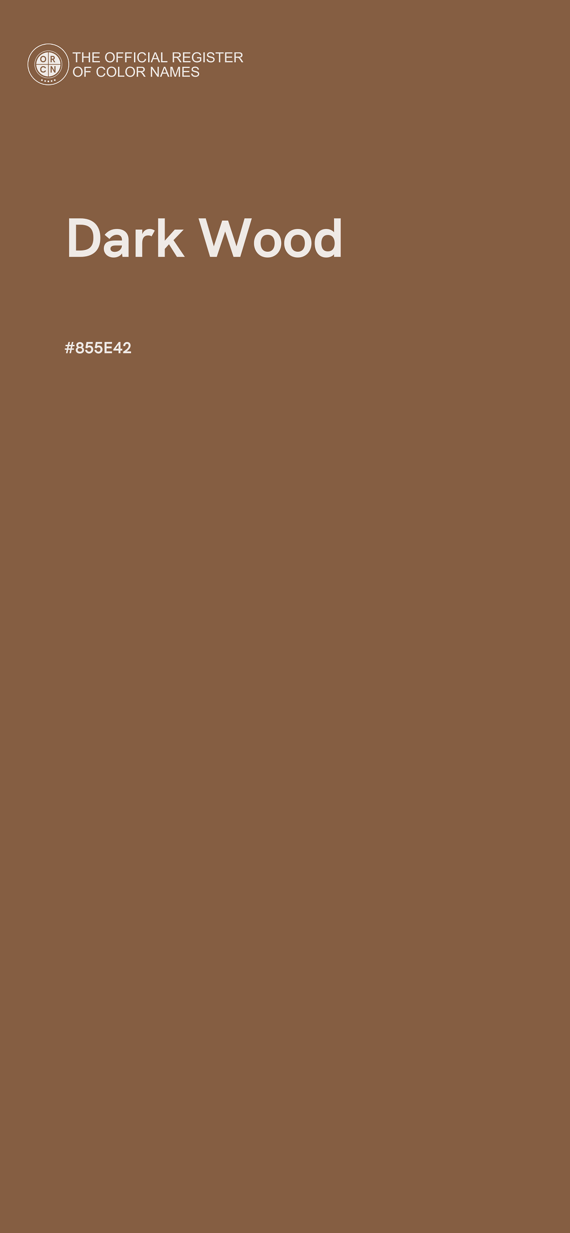The digital color HEX #855E42, known as "Dark Wood", belongs to the Orange Color Family featuring Mild Saturation (Saturation Family) and Neutral (Brightness Family).