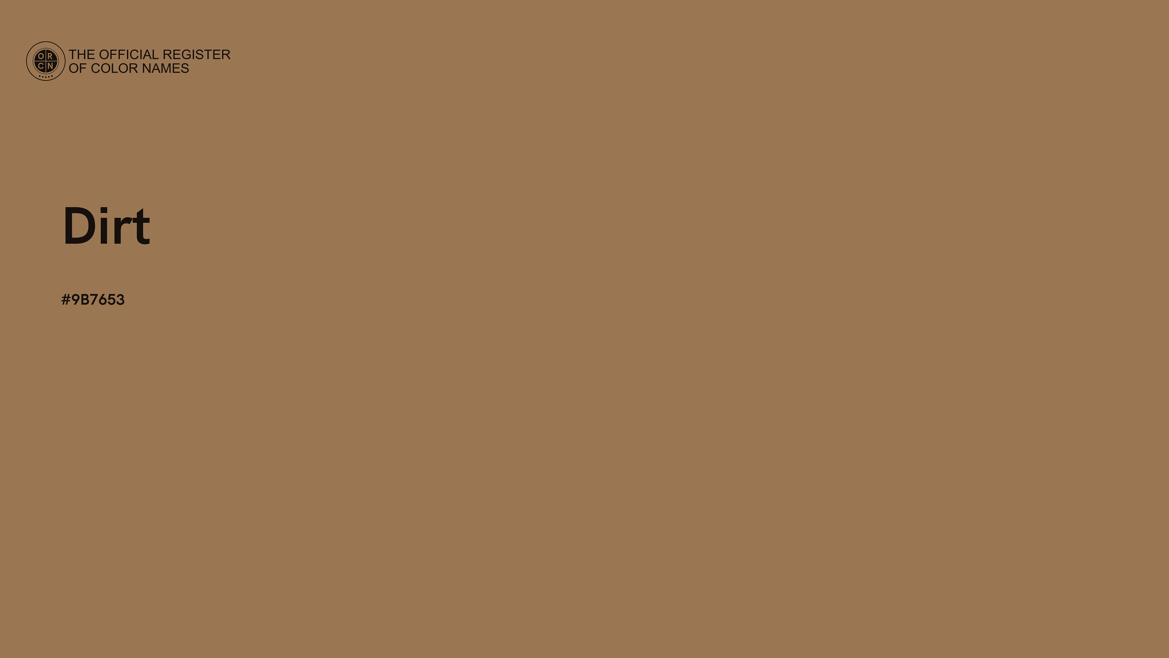 The digital color HEX #9B7653, known as "Dirt", belongs to the Orange Color Family featuring Mild Saturation (Saturation Family) and Light (Brightness Family).