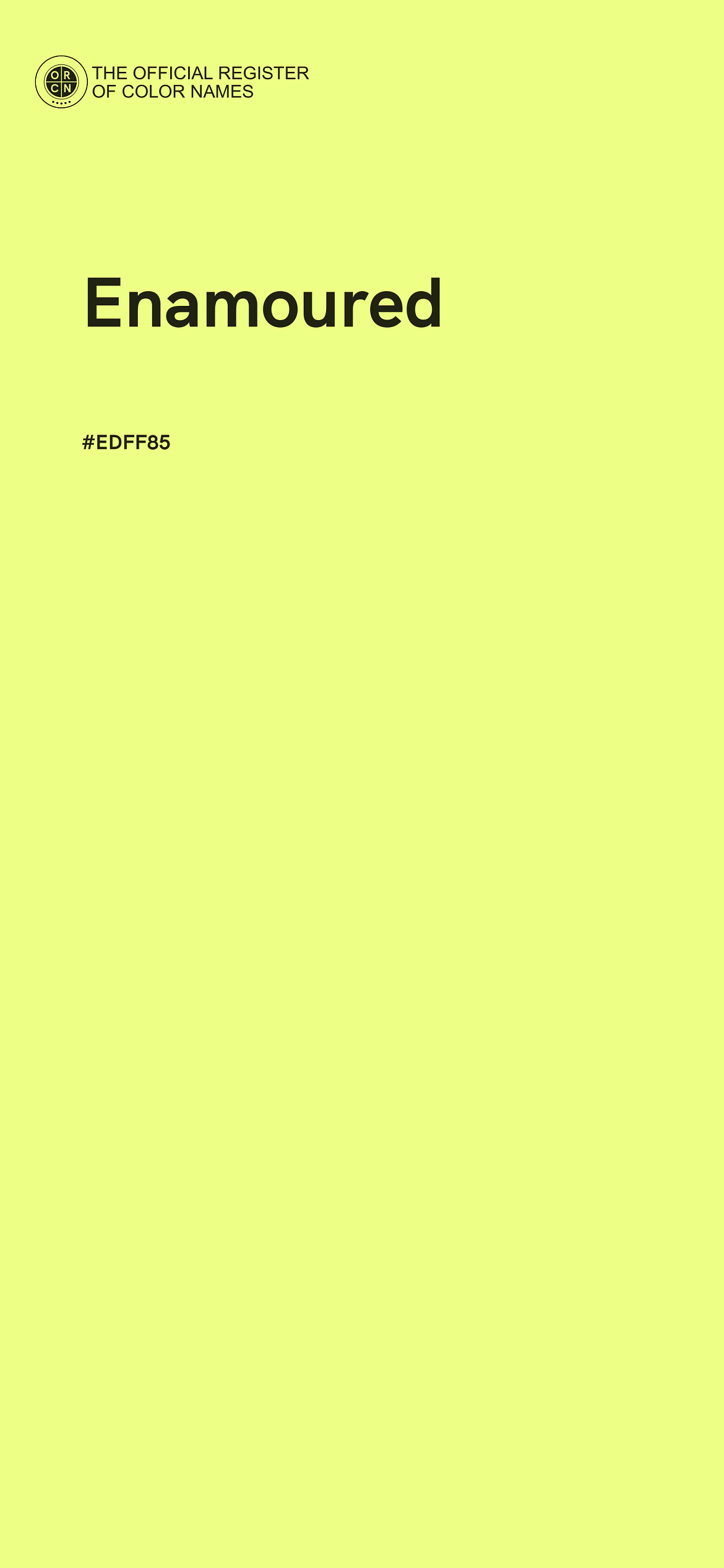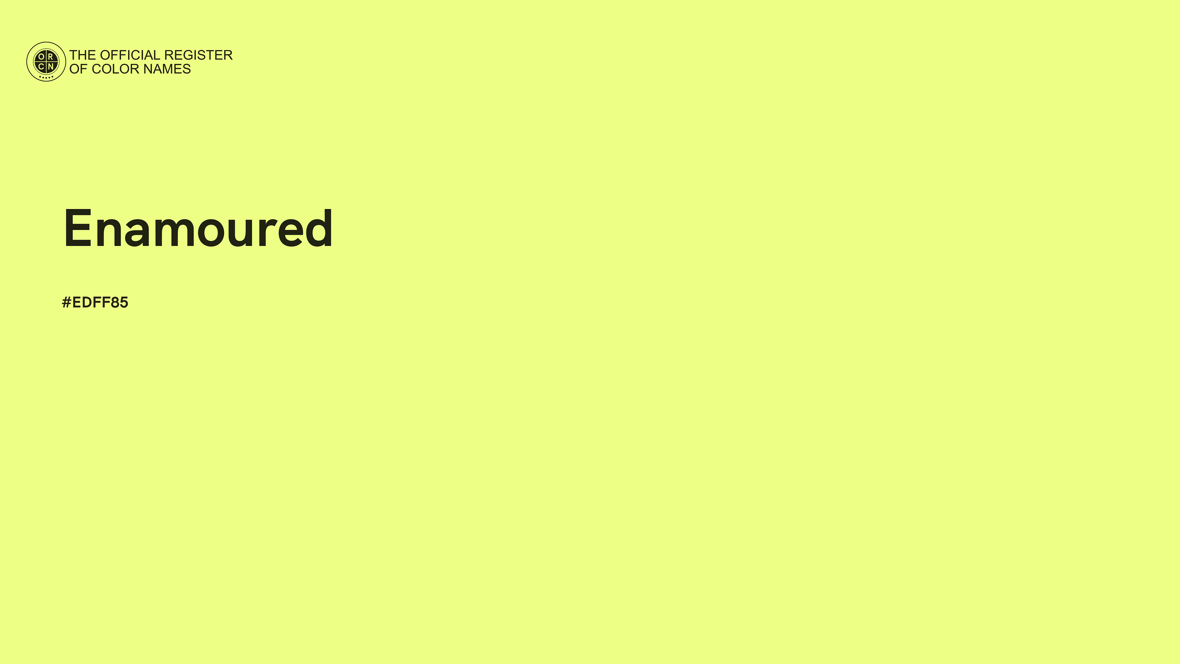 The digital color HEX #EDFF85, known as "Enamoured", belongs to the Yellow Color Family featuring Full Saturation (Saturation Family) and Very Light (Brightness Family).