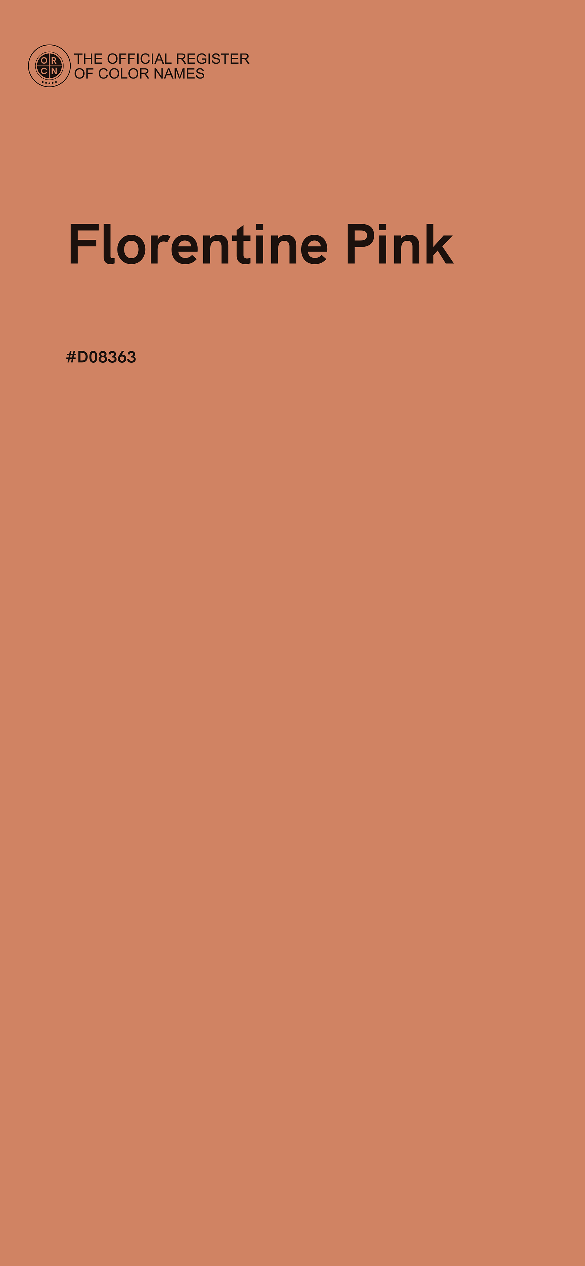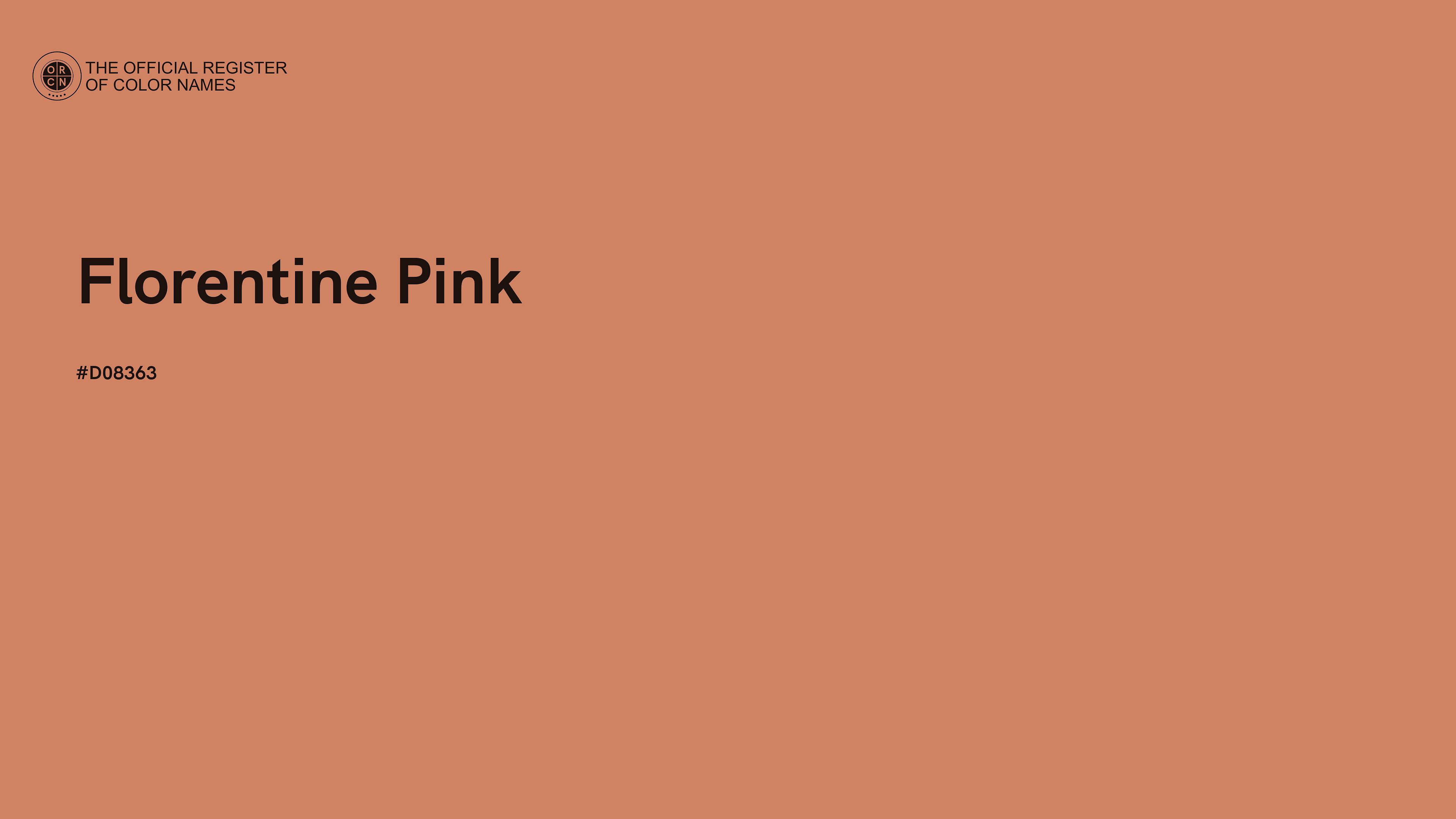 The digital color HEX #D08363, known as "Florentine Pink", belongs to the Orange Color Family featuring Moderate Saturation (Saturation Family) and Very Light (Brightness Family).