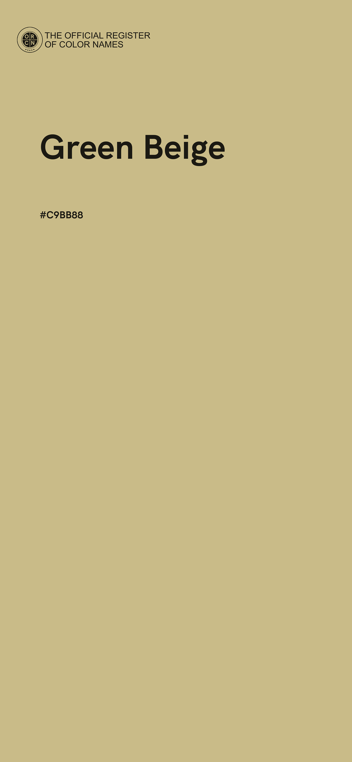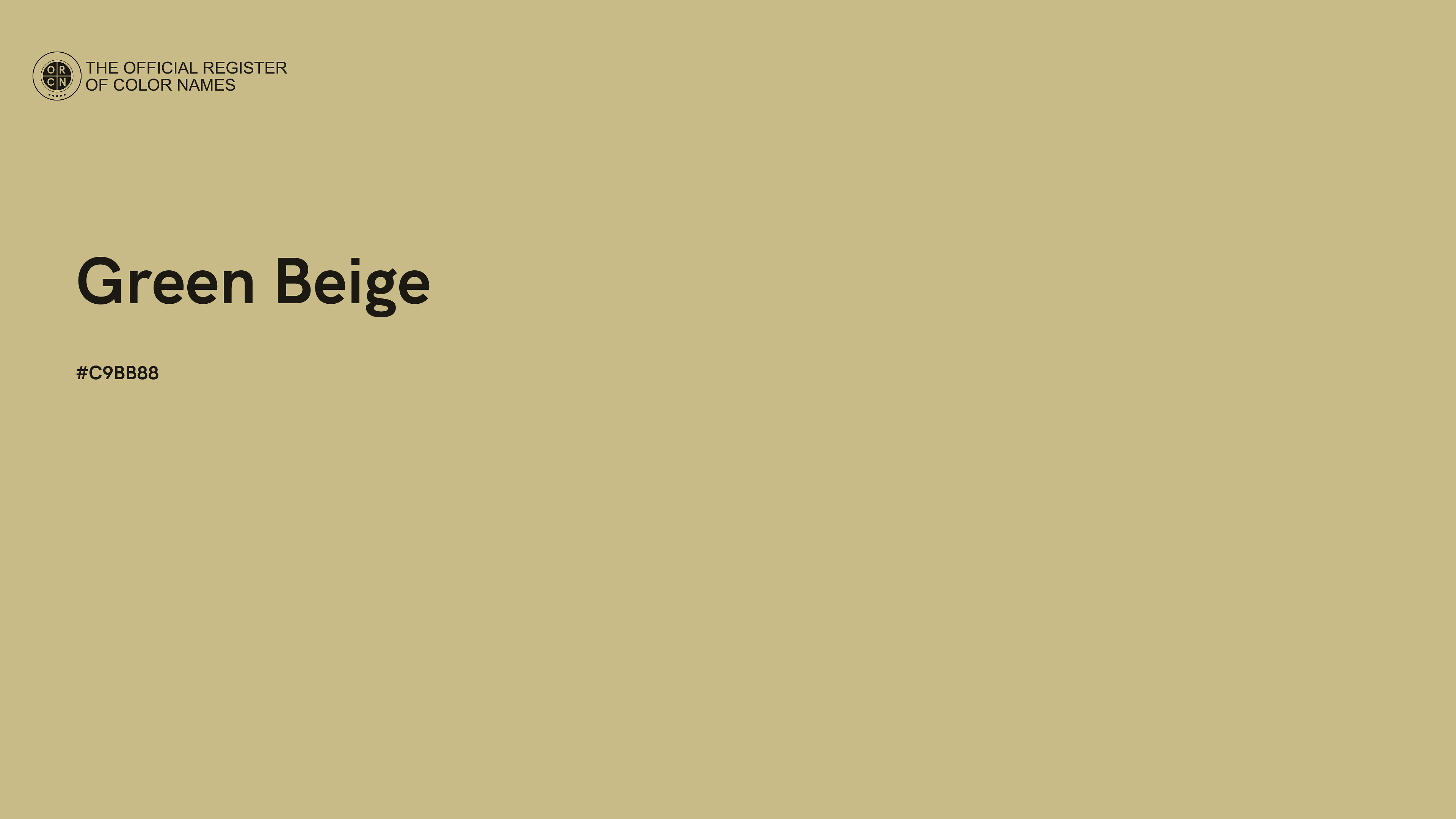 The digital color HEX #C9BB88, known as "Green Beige", belongs to the Yellow Color Family featuring Mild Saturation (Saturation Family) and Very Light (Brightness Family).
