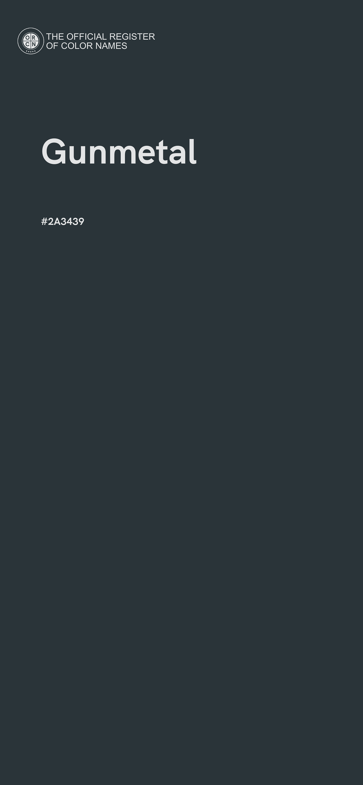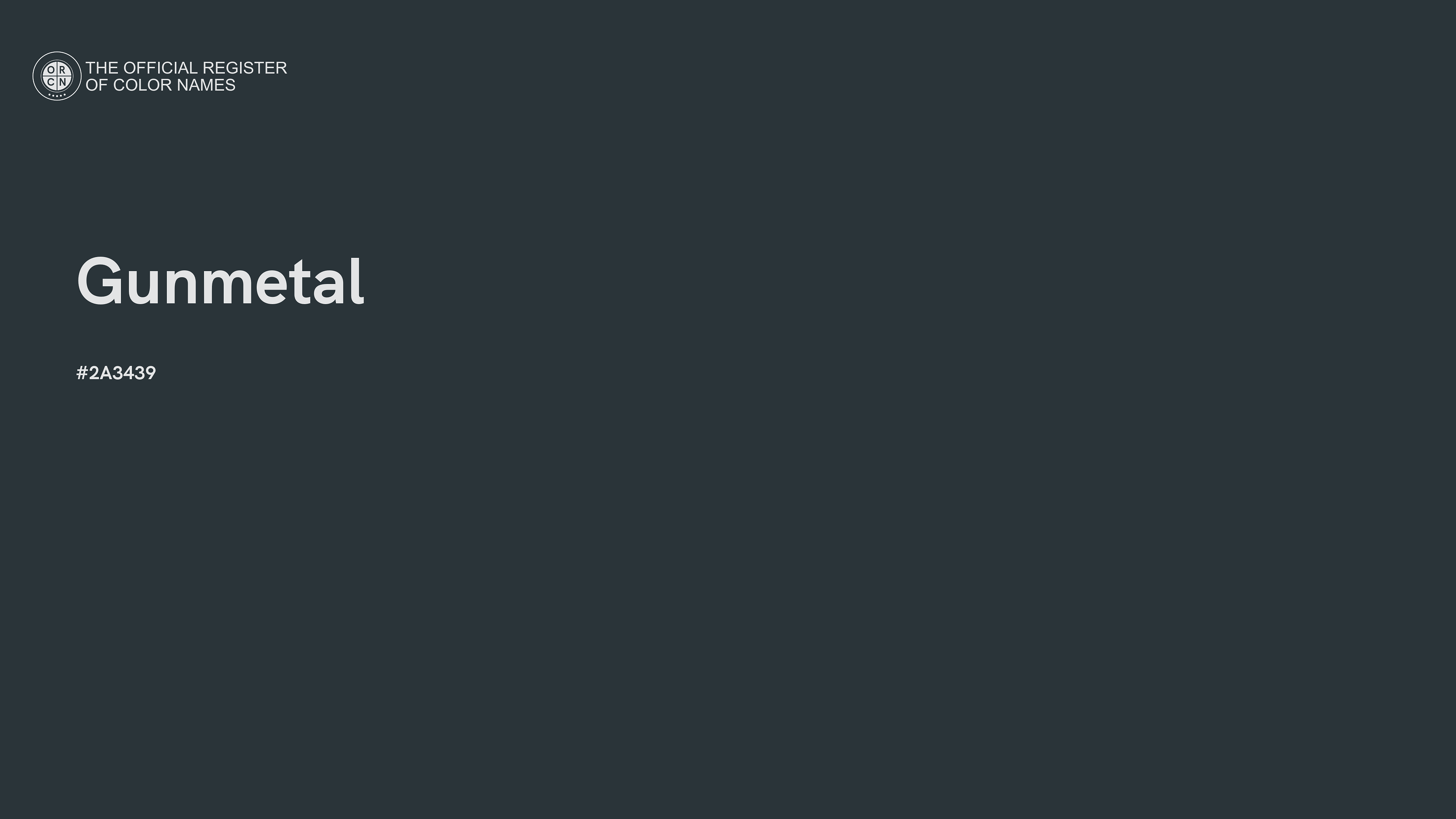 The digital color HEX #2A3439, known as "Gunmetal", belongs to the Azure Color Family featuring Low Saturation (Saturation Family) and Dark (Brightness Family).