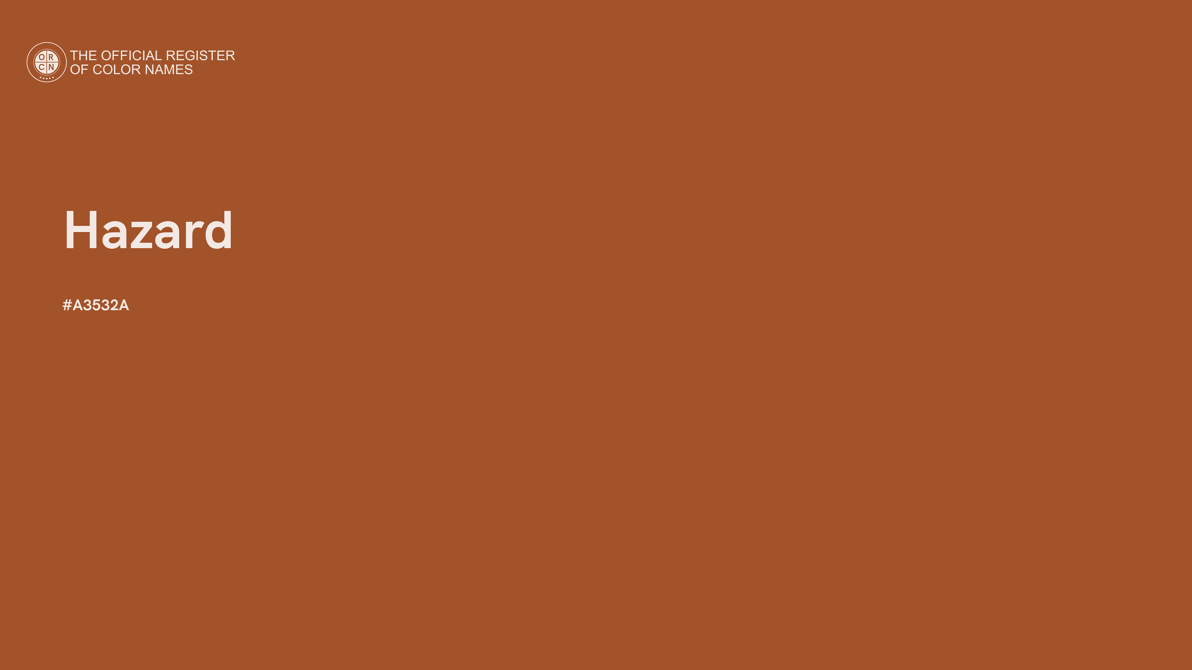 The digital color HEX #A3532A, known as "Hazard", belongs to the Orange Color Family featuring Moderate Saturation (Saturation Family) and Light (Brightness Family).