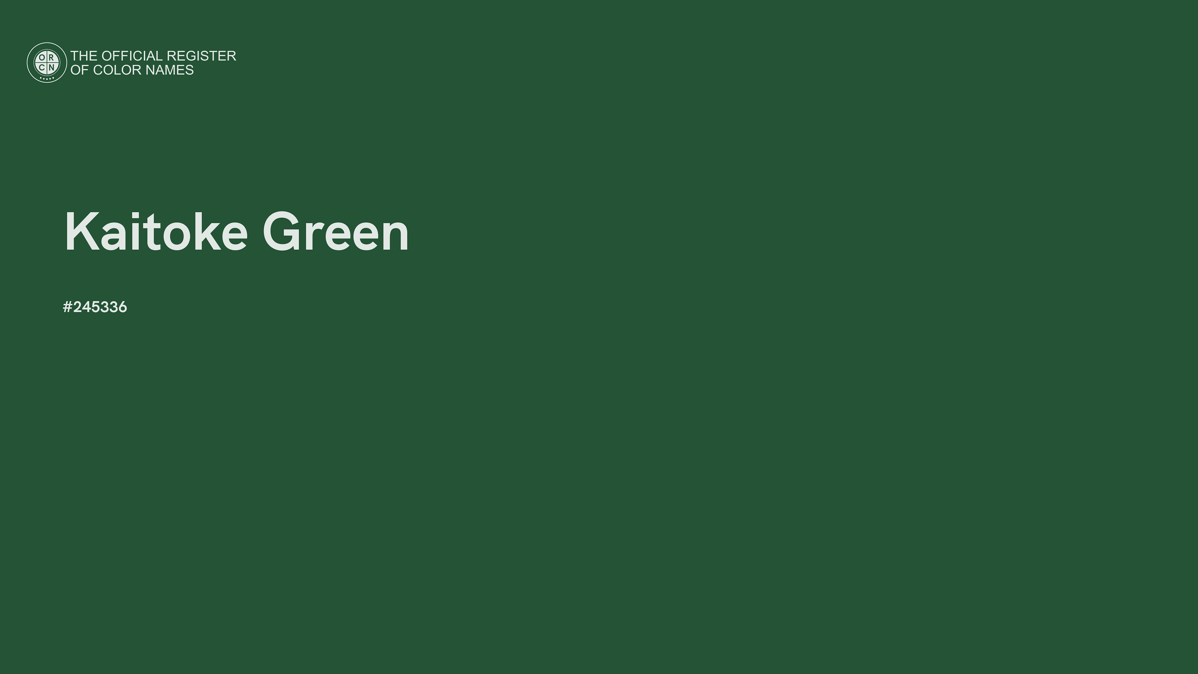 The digital color HEX #245336, known as "Kaitoke Green", belongs to the Spring Green Color Family featuring Mild Saturation (Saturation Family) and Dark (Brightness Family).