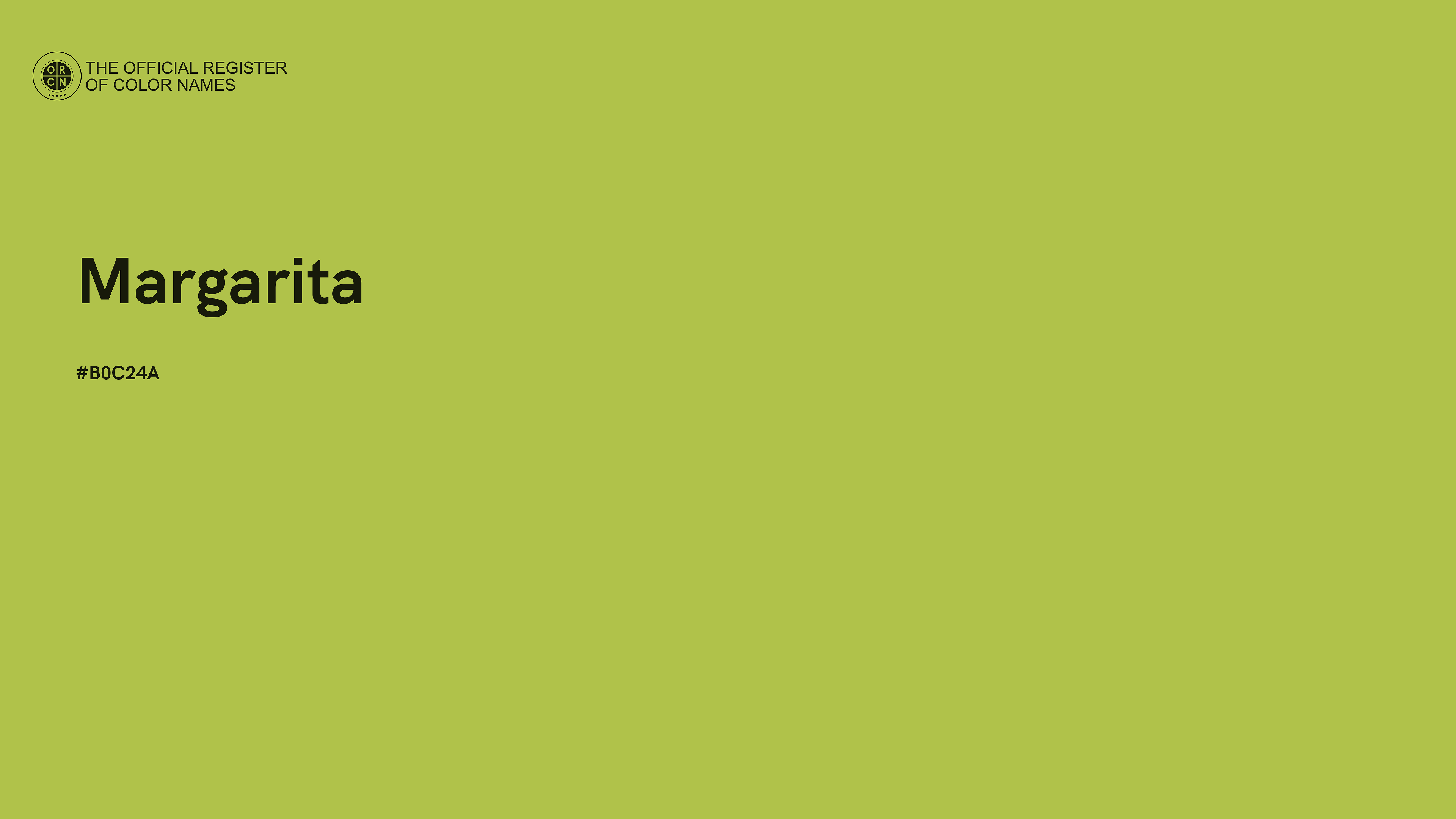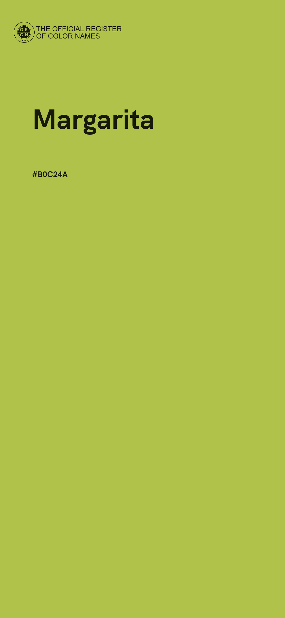 The digital color HEX #B0C24A, known as "Margarita", belongs to the Yellow Color Family featuring Moderate Saturation (Saturation Family) and Light (Brightness Family).