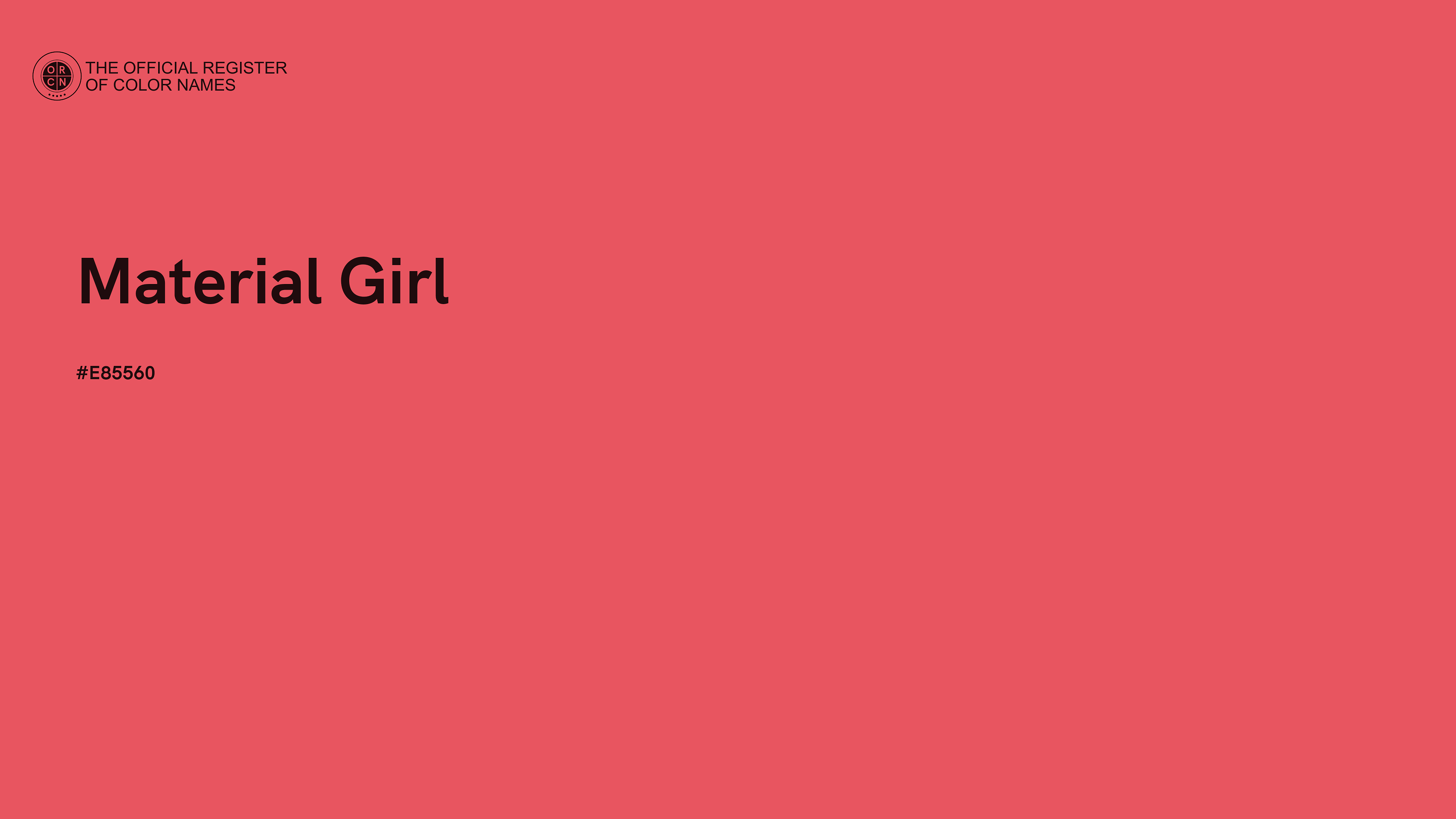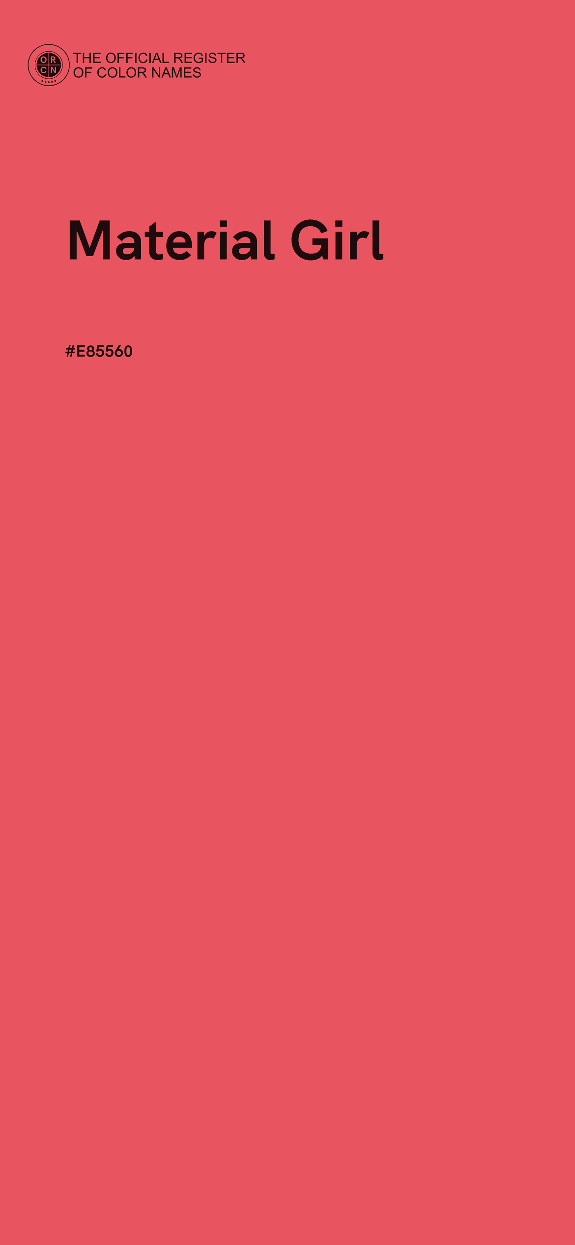 The digital color HEX #E85560, known as "Material Girl", belongs to the Red Color Family featuring High Saturation (Saturation Family) and Very Light (Brightness Family).
