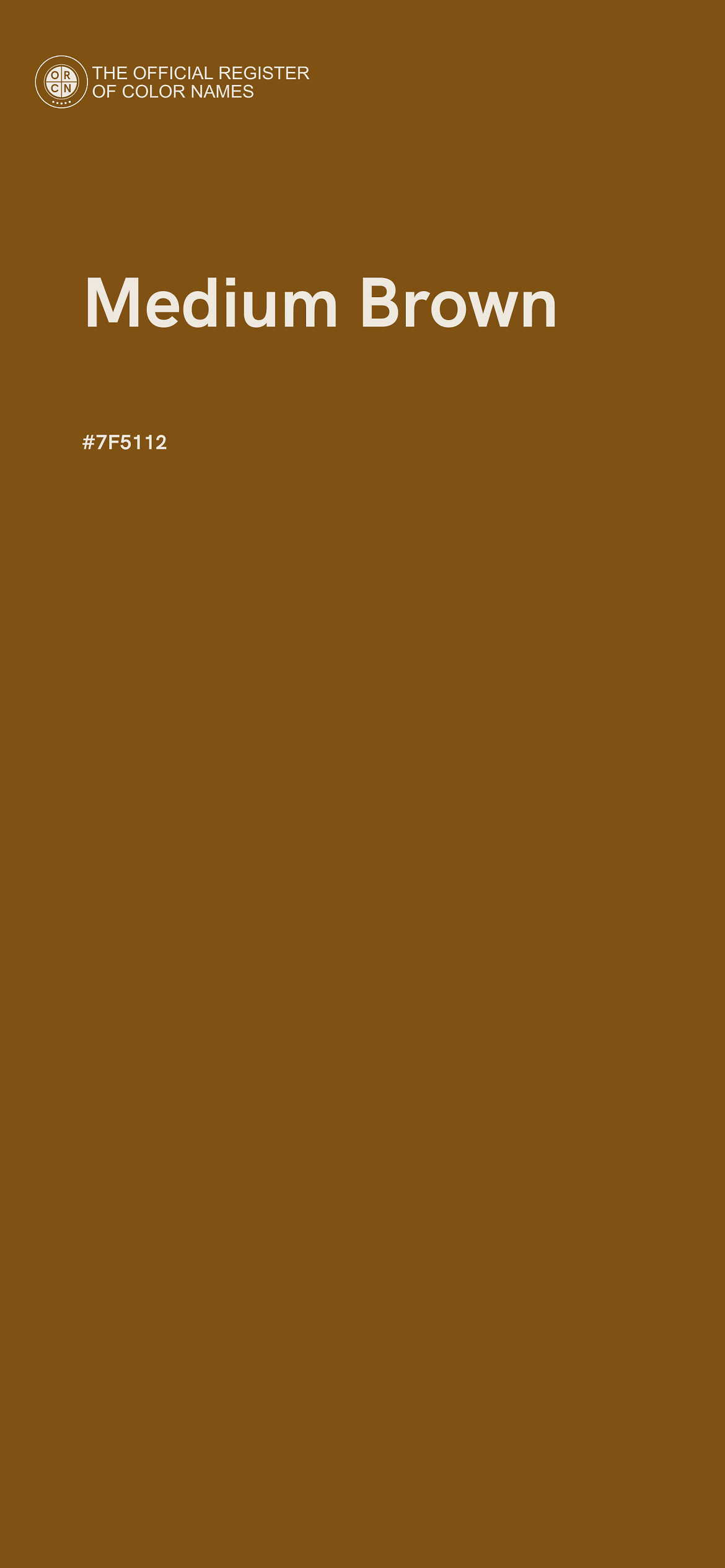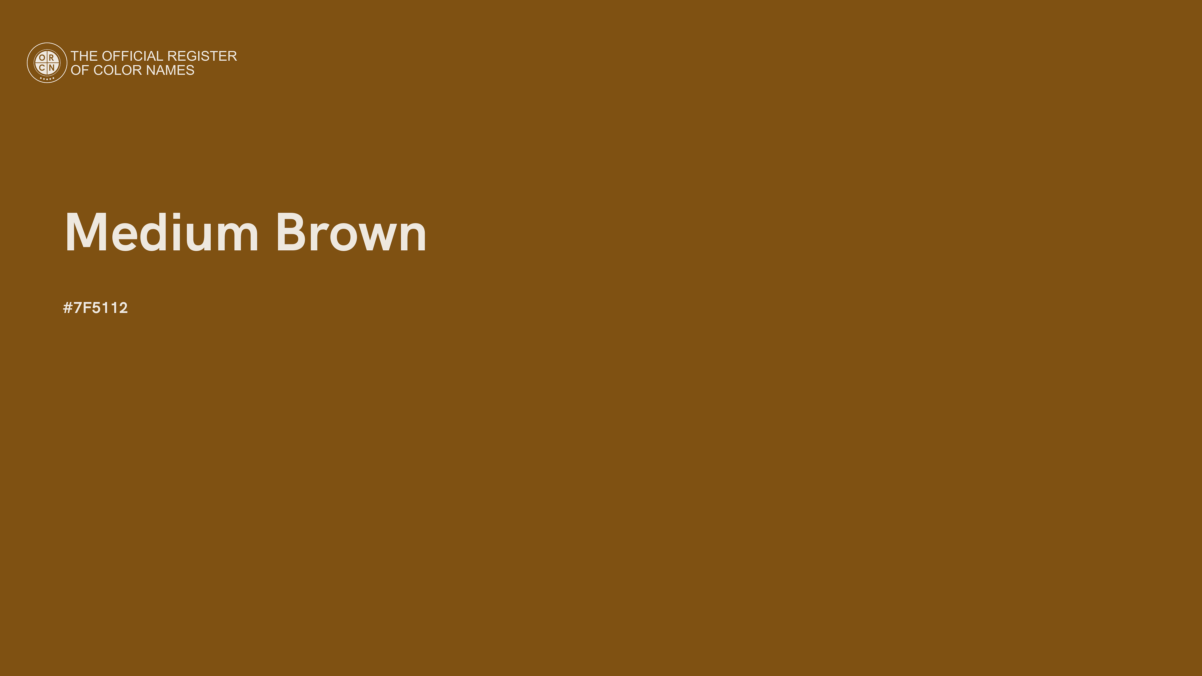 The digital color HEX #7F5112, known as "Medium Brown", belongs to the Orange Color Family featuring High Saturation (Saturation Family) and Neutral (Brightness Family).