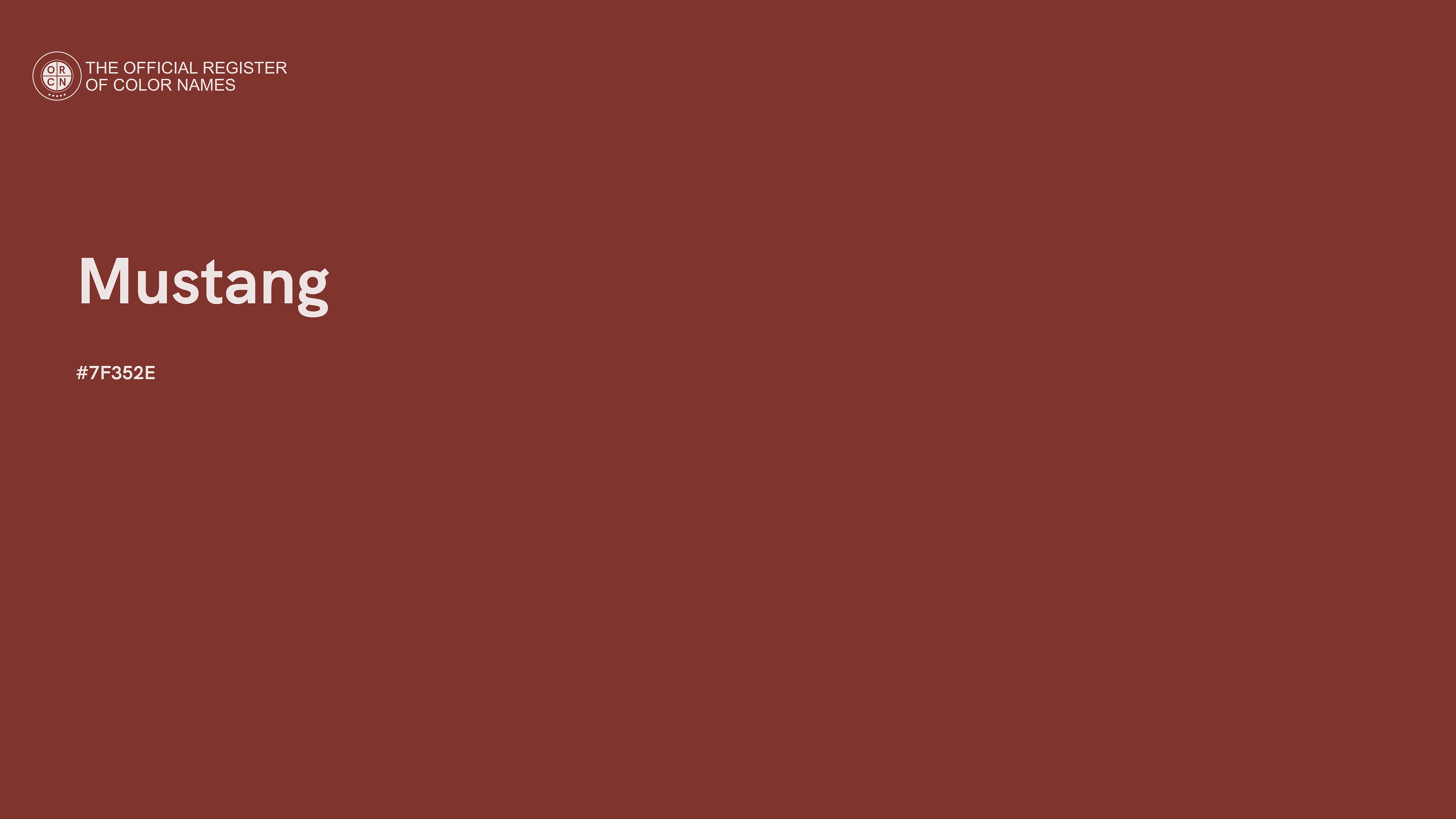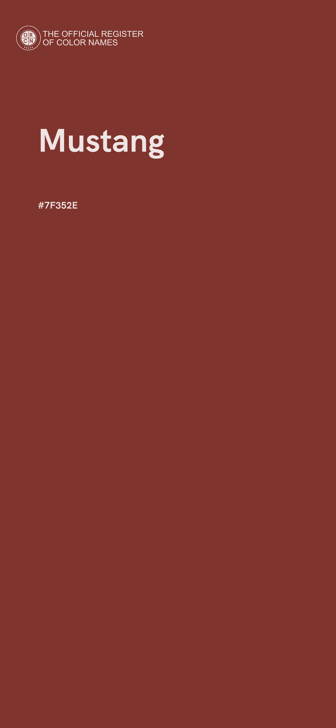 The digital color HEX #7F352E, known as "Mustang", belongs to the Red Color Family featuring Moderate Saturation (Saturation Family) and Neutral (Brightness Family).