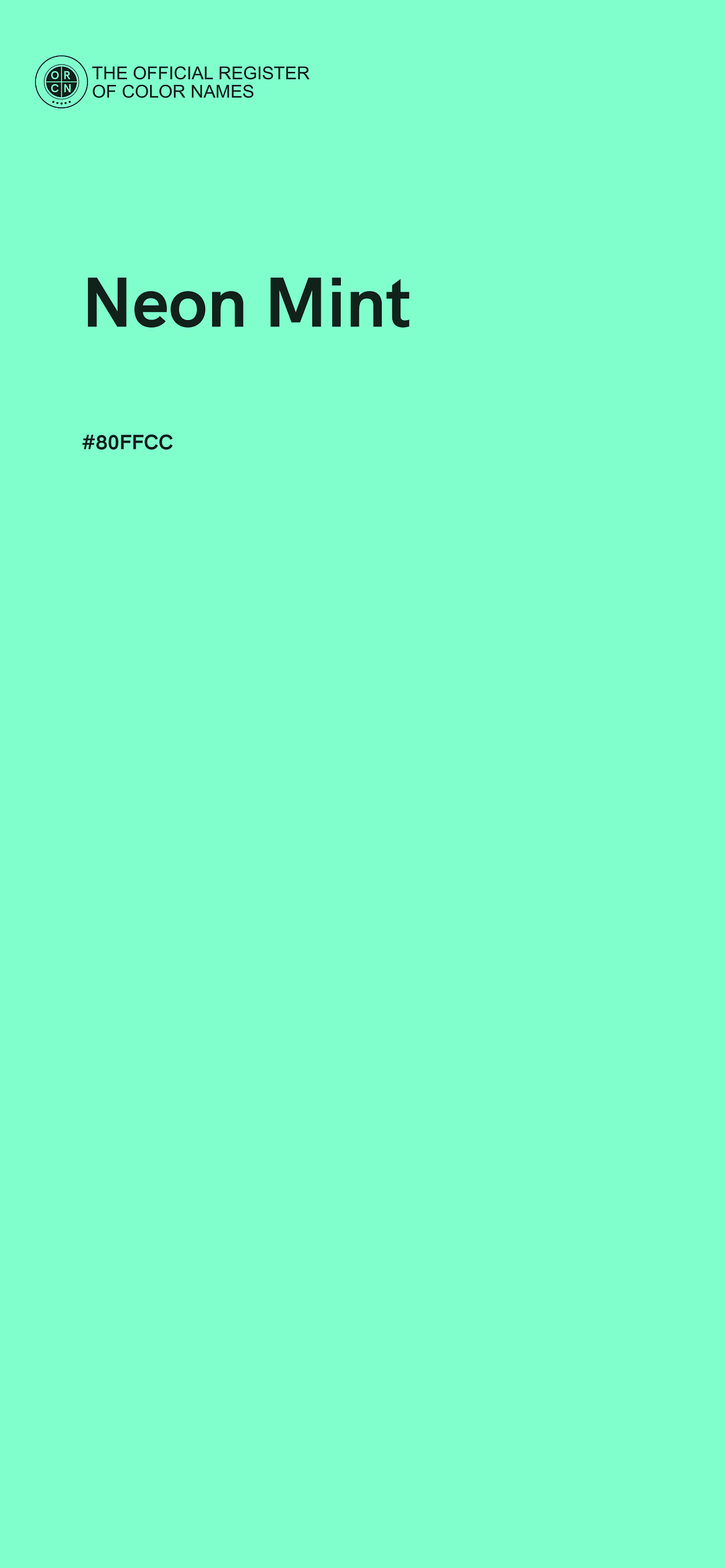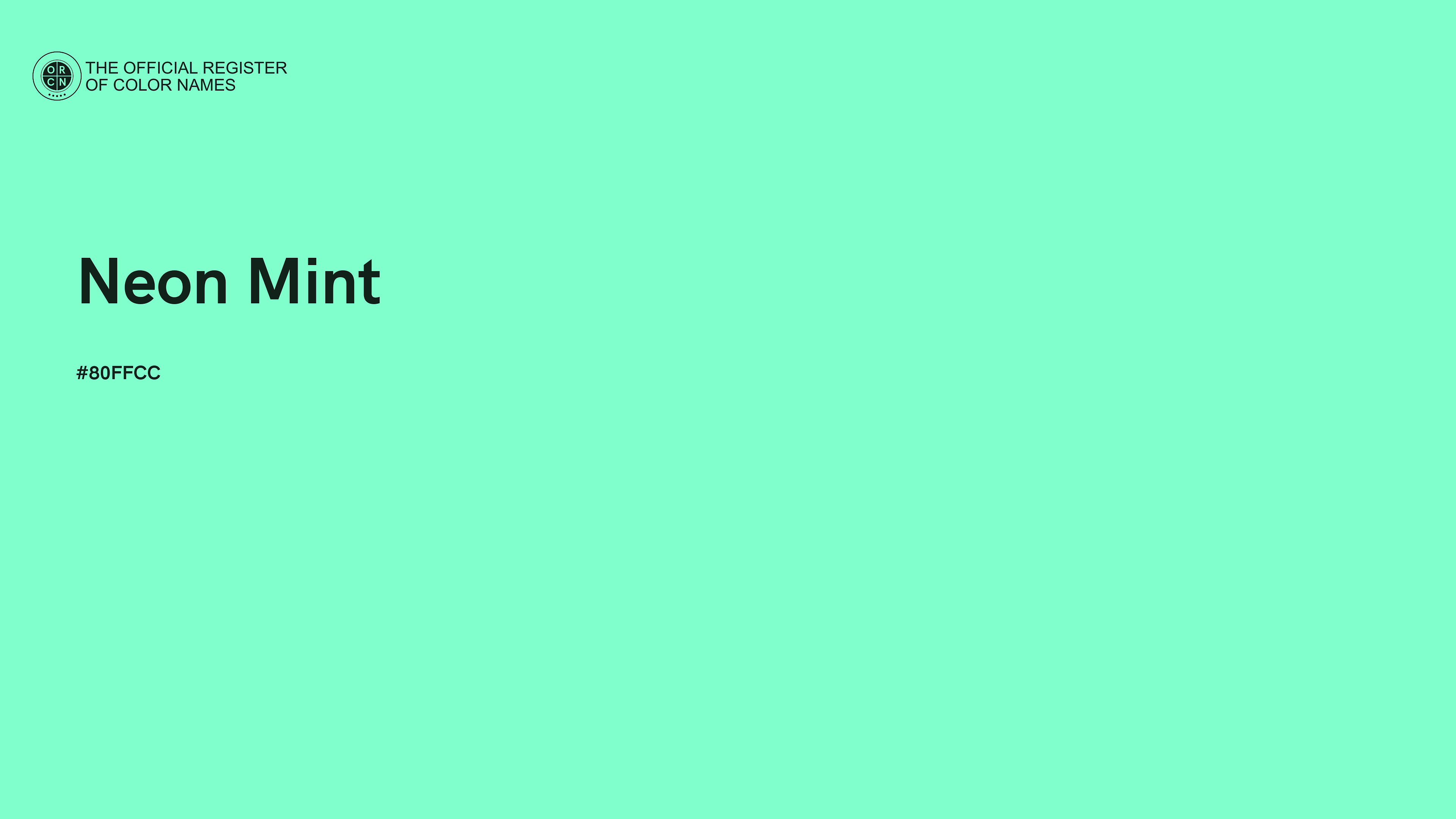 The digital color HEX #80FFCC, known as "Neon Mint", belongs to the Spring Green Color Family featuring Full Saturation (Saturation Family) and Very Light (Brightness Family).