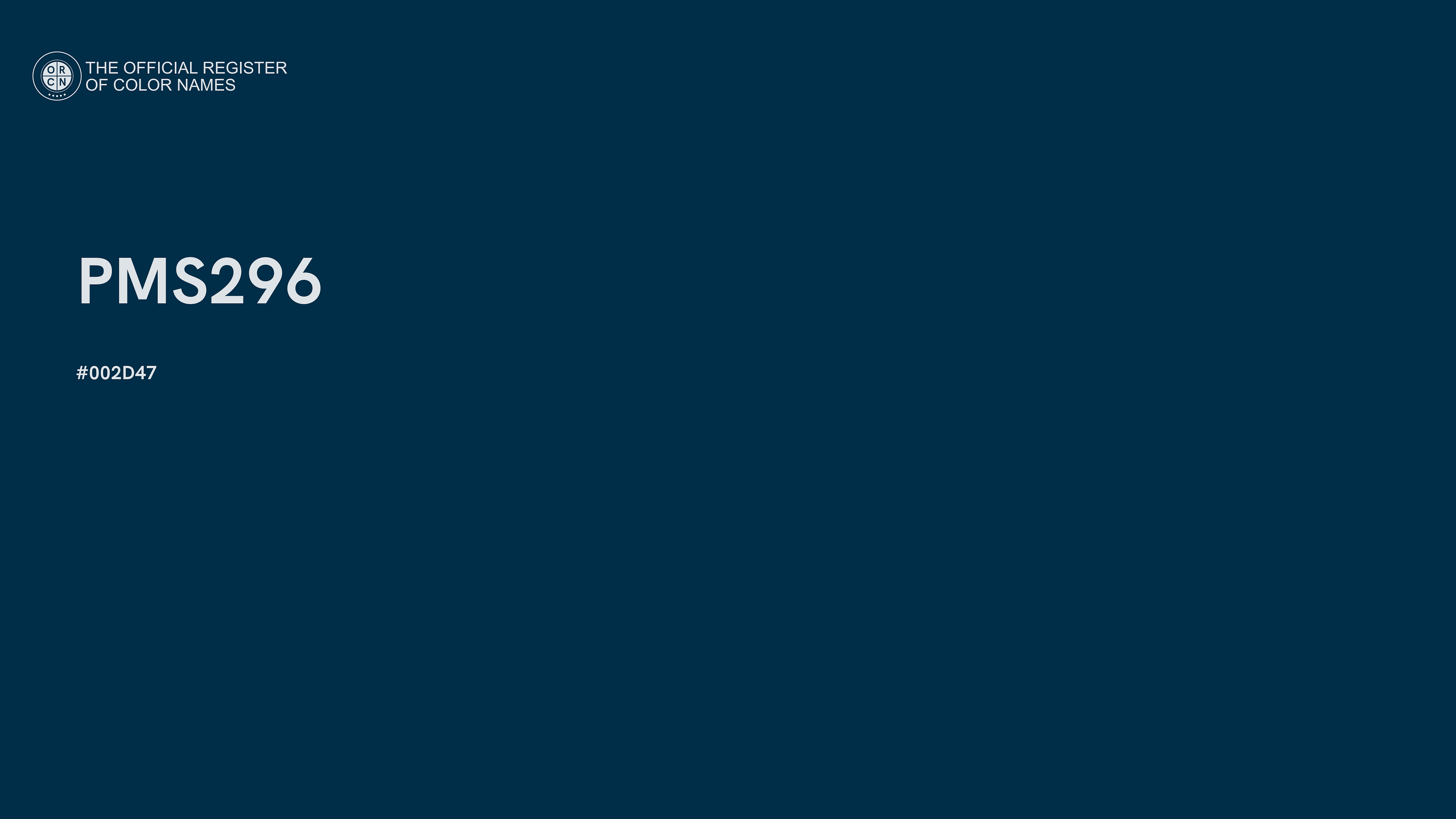 The digital color HEX #002D47, known as "PMS296", belongs to the Azure Color Family featuring Full Saturation (Saturation Family) and Dark (Brightness Family).