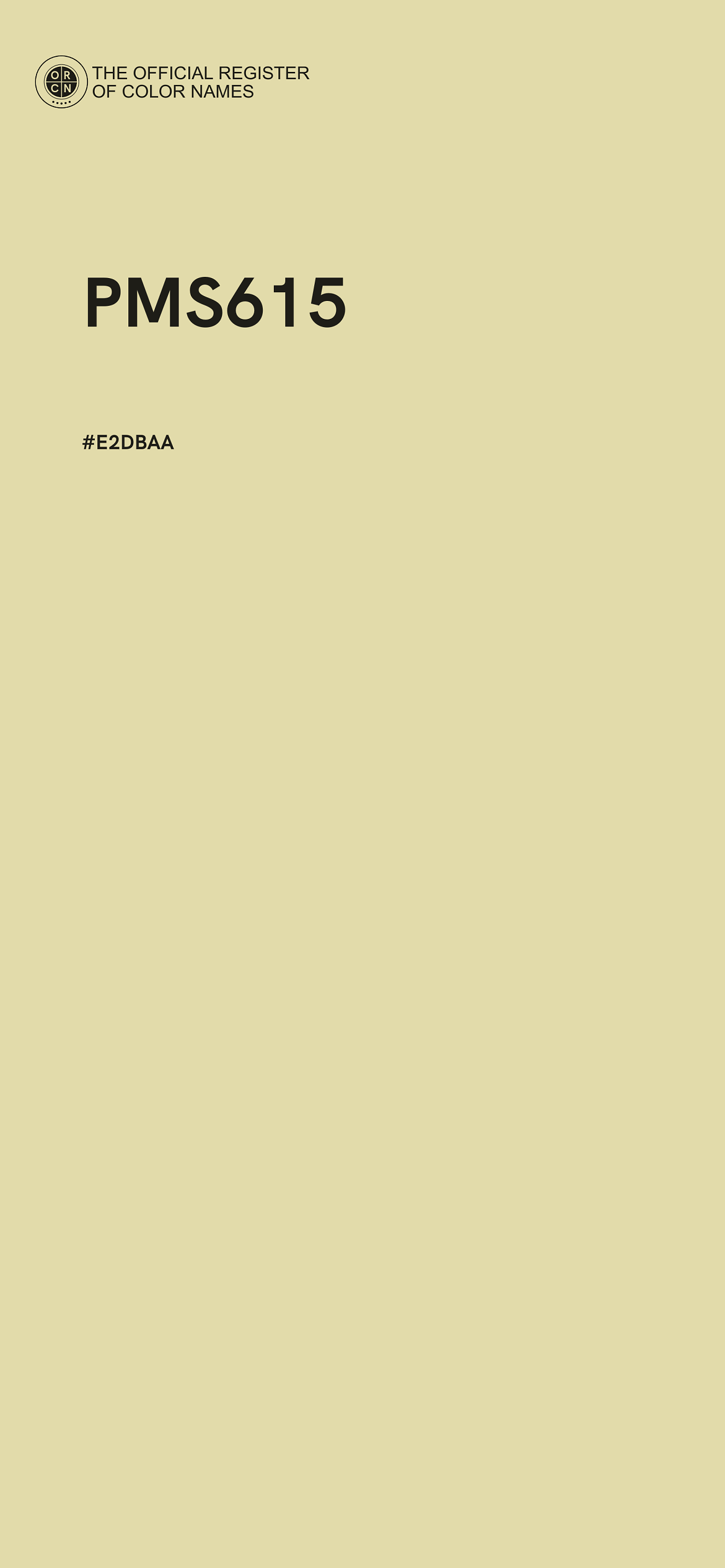 The digital color HEX #E2DBAA, known as "PMS615", belongs to the Yellow Color Family featuring Moderate Saturation (Saturation Family) and Very Light (Brightness Family).