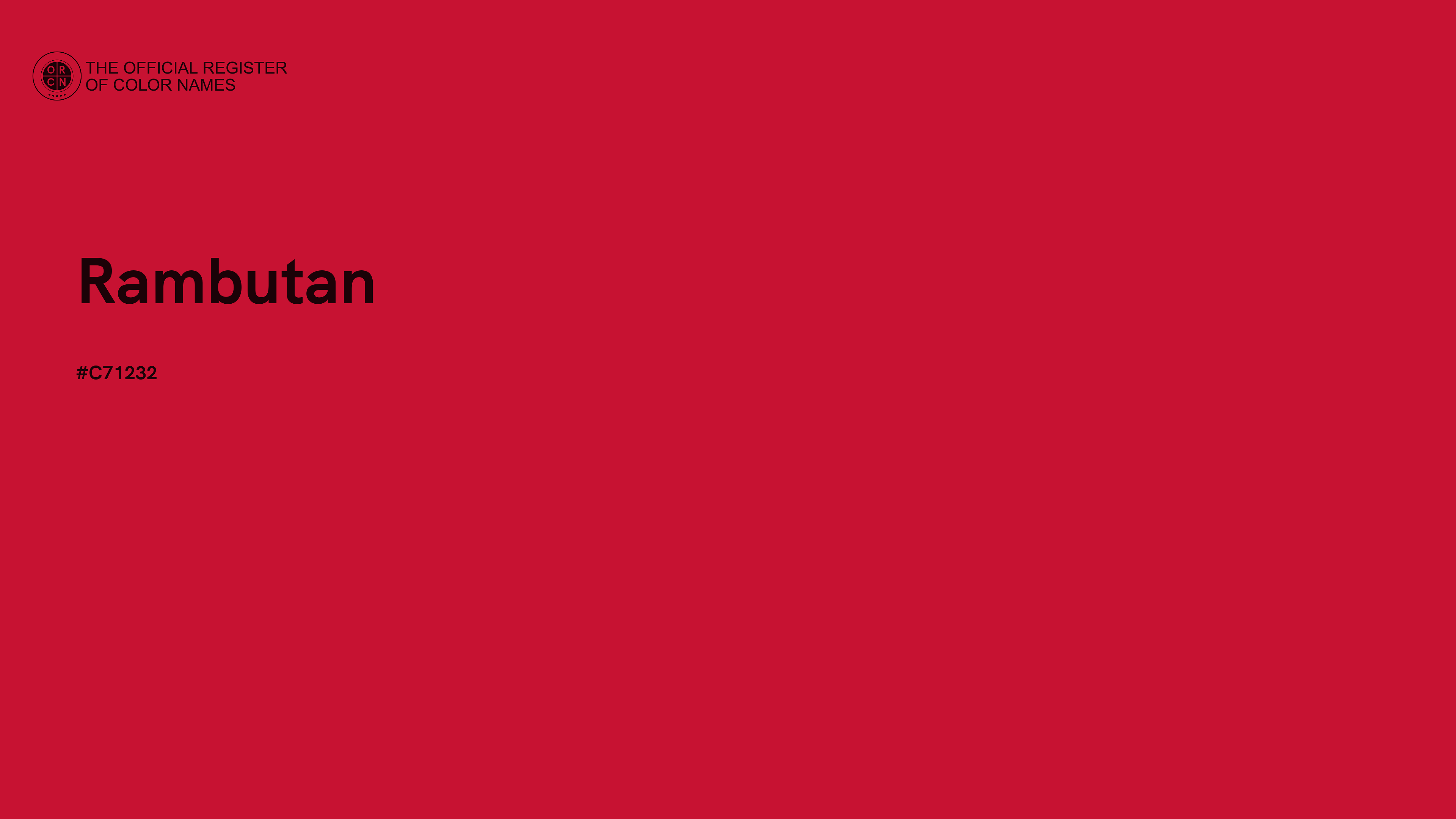 The digital color HEX #C71232, known as "Rambutan", belongs to the Red Color Family featuring High Saturation (Saturation Family) and Light (Brightness Family).
