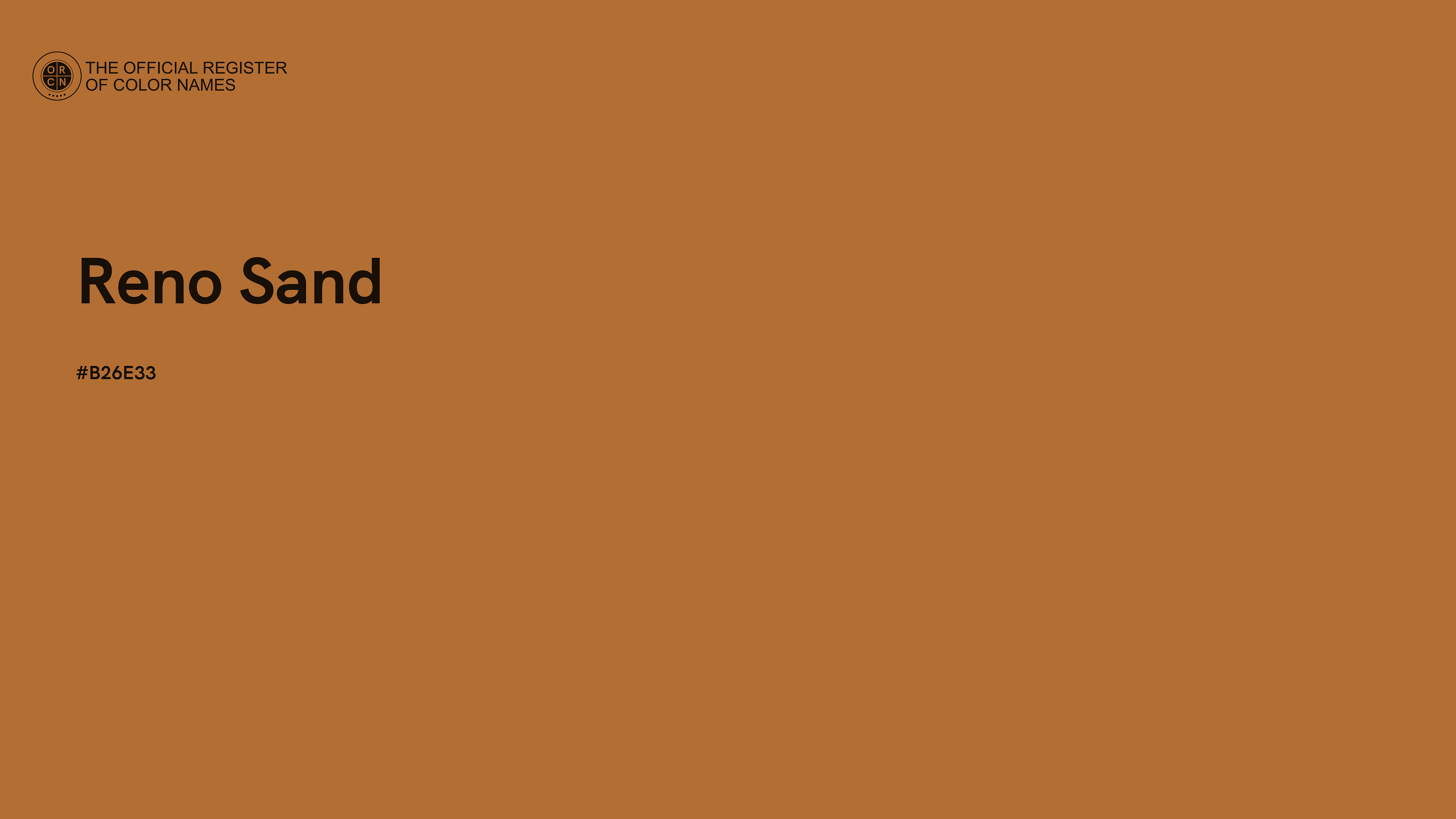 The digital color HEX #B26E33, known as "Reno Sand", belongs to the Orange Color Family featuring Moderate Saturation (Saturation Family) and Light (Brightness Family).