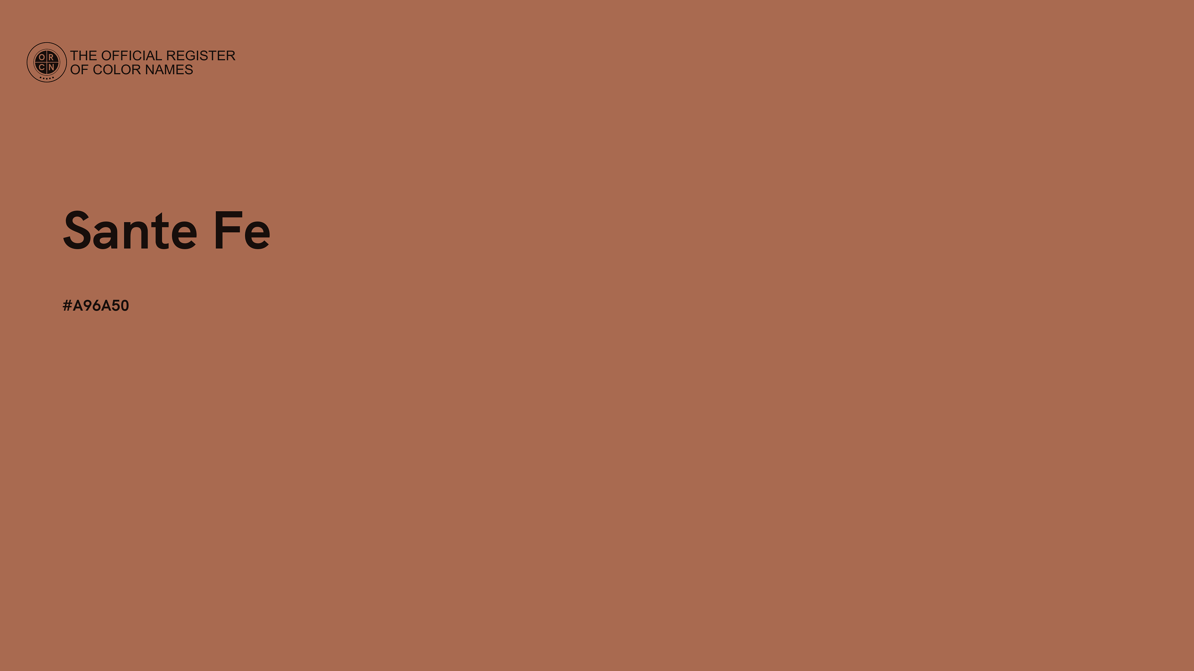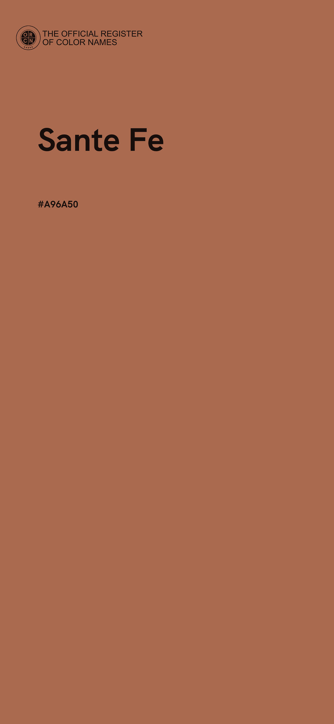 The digital color HEX #A96A50, known as "Sante Fe", belongs to the Orange Color Family featuring Mild Saturation (Saturation Family) and Light (Brightness Family).
