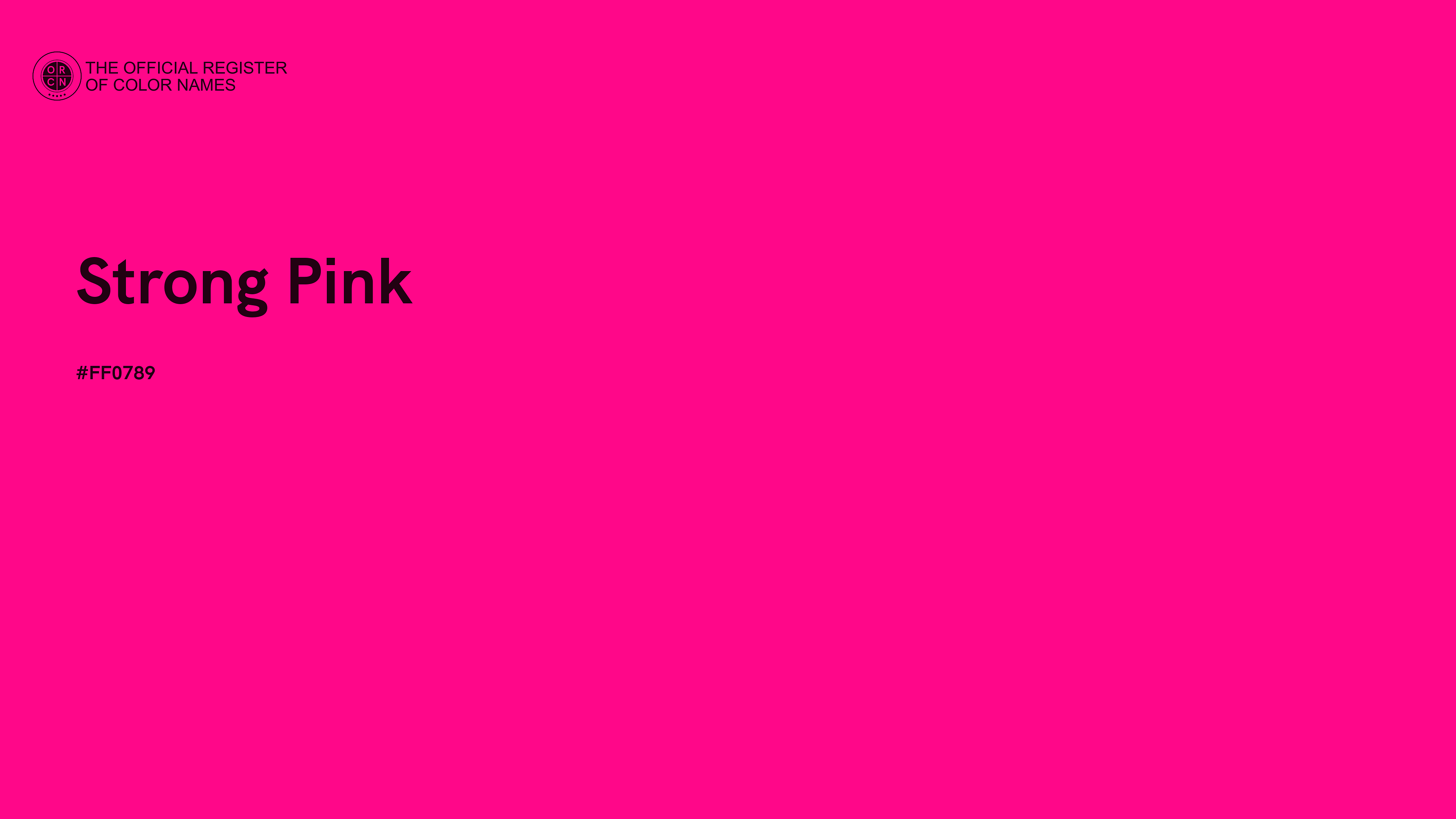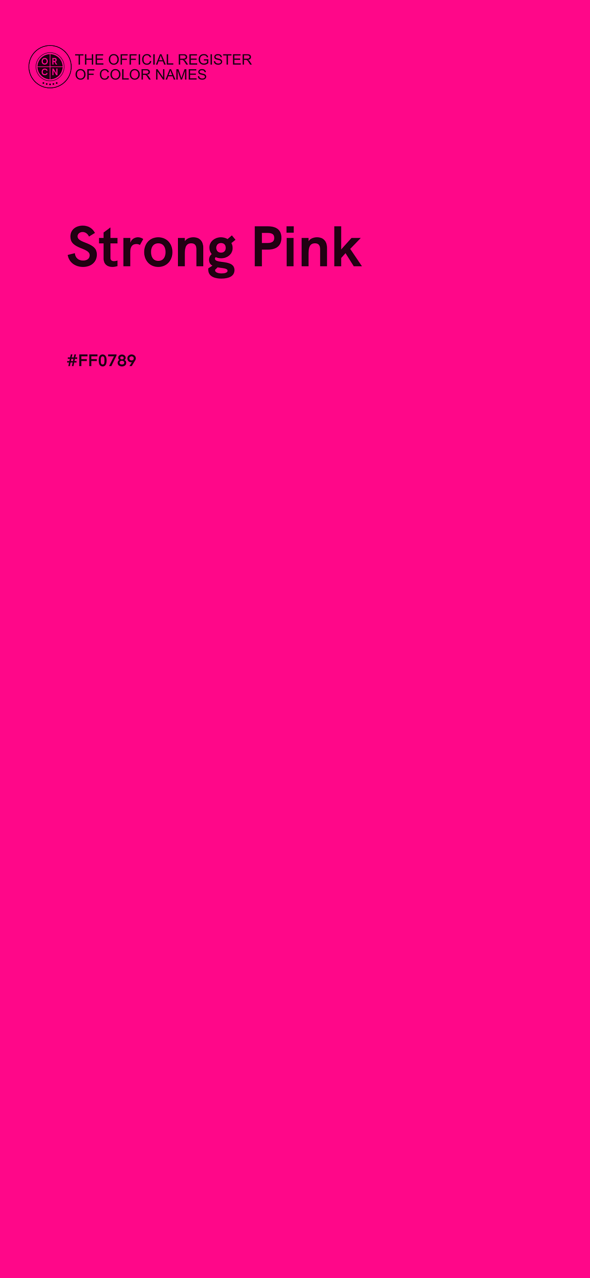 The digital color HEX #FF0789, known as "Strong Pink", belongs to the Rose Color Family featuring Full Saturation (Saturation Family) and Light (Brightness Family).