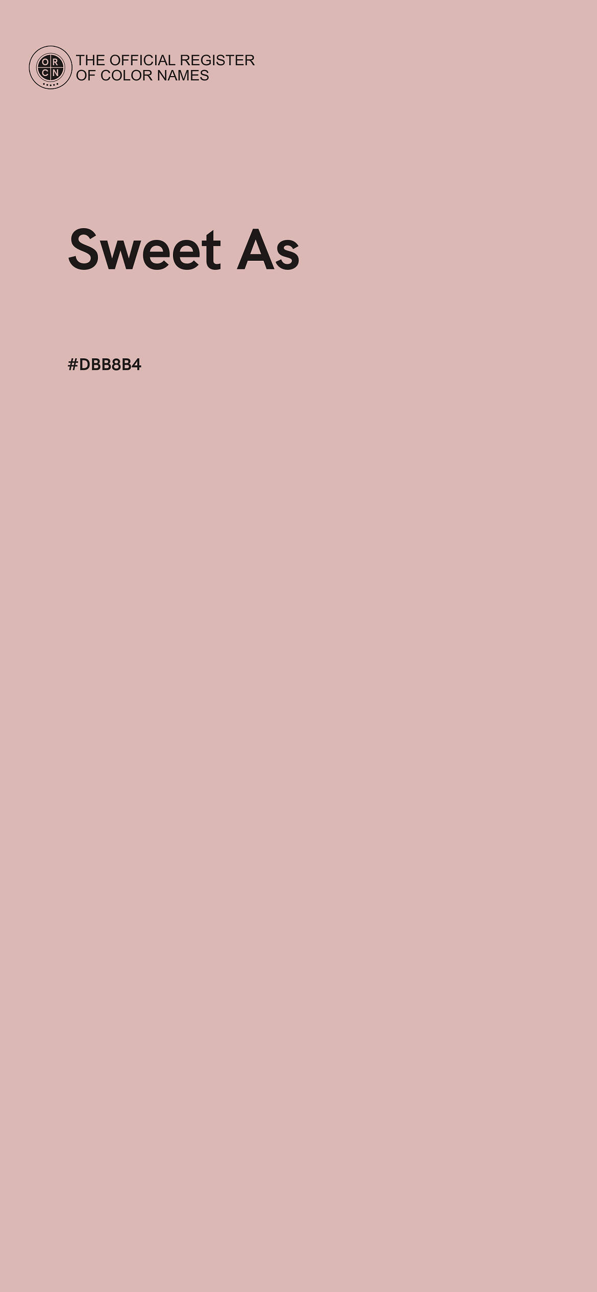 The digital color HEX #DBB8B4, known as "Sweet As", belongs to the Red Color Family featuring Mild Saturation (Saturation Family) and Very Light (Brightness Family).