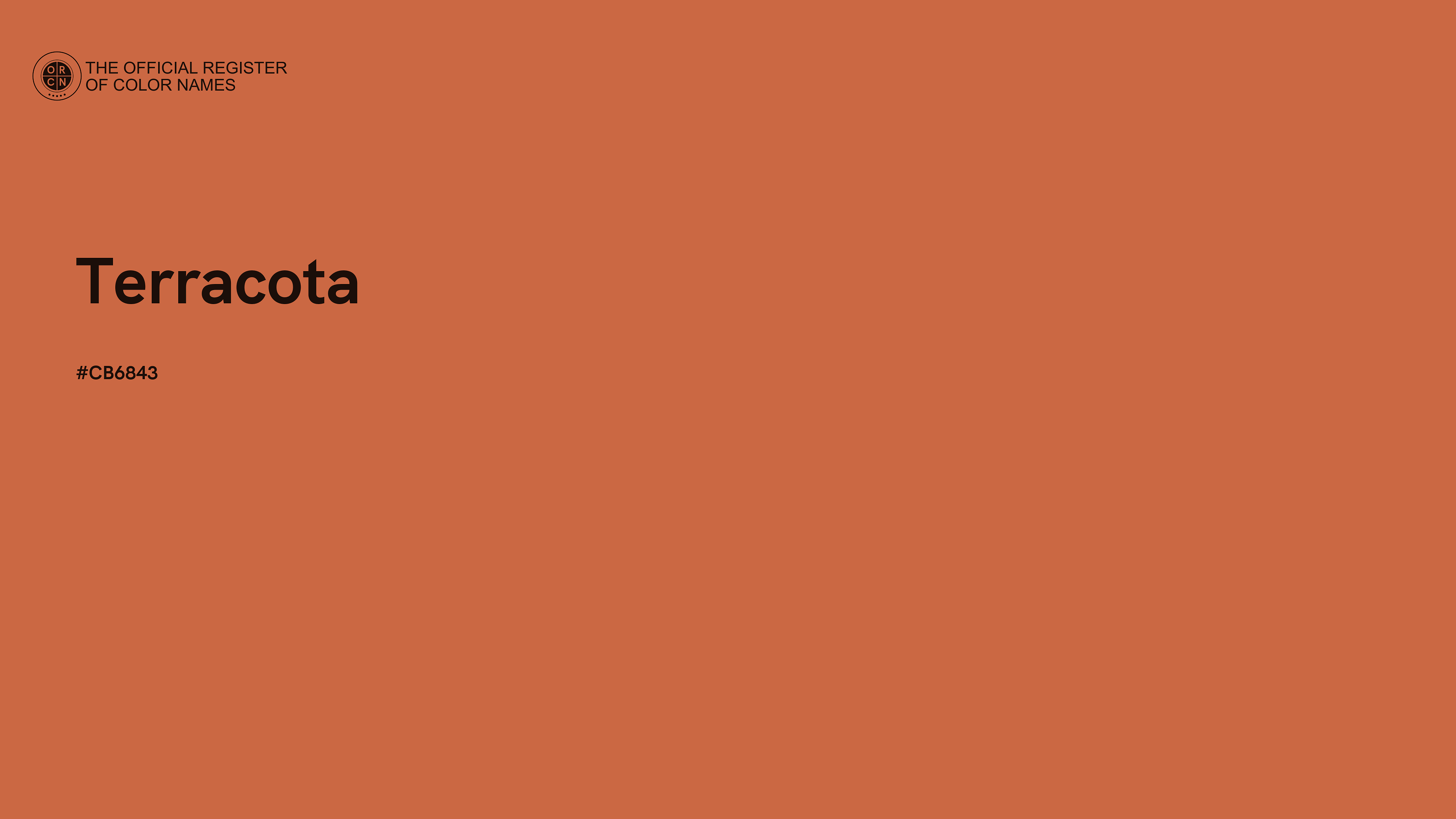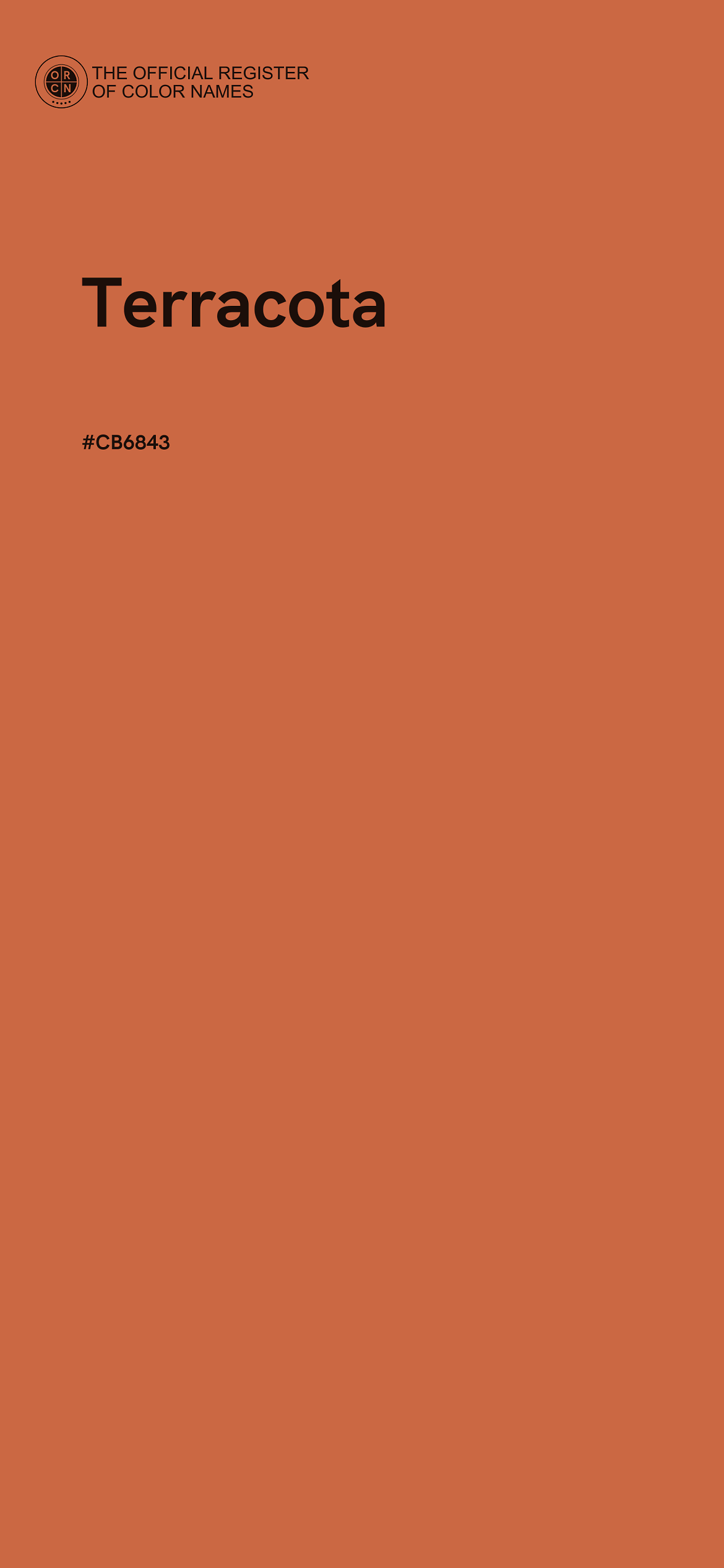 The digital color HEX #CB6843, known as "Terracota", belongs to the Orange Color Family featuring Moderate Saturation (Saturation Family) and Light (Brightness Family).