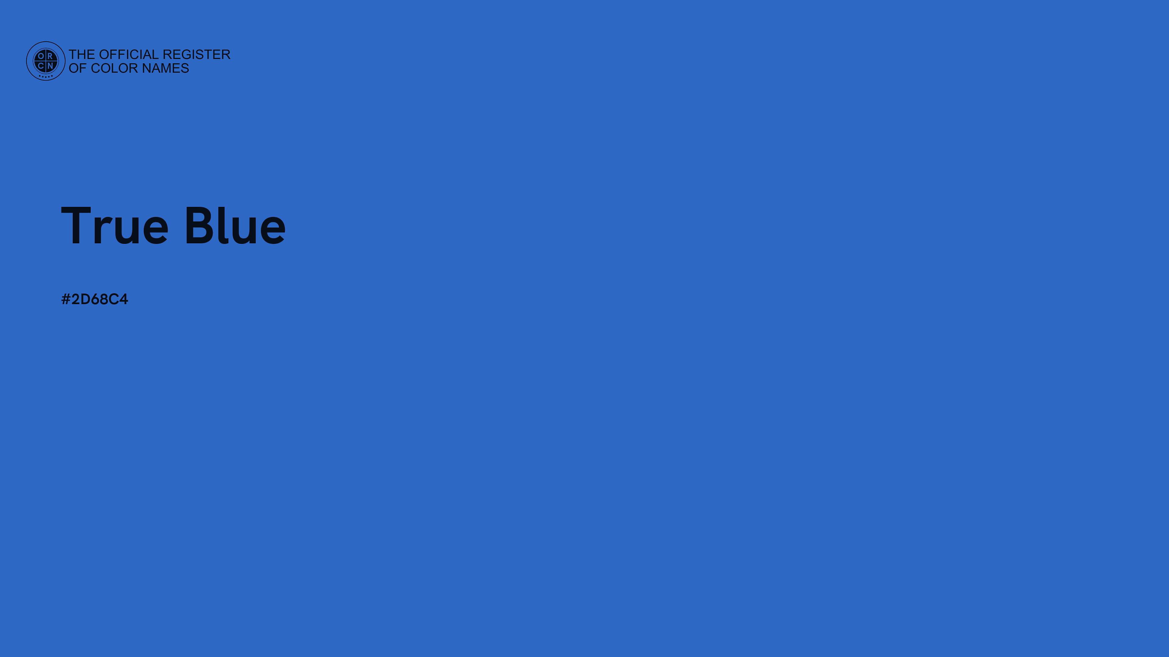 The digital color HEX #2D68C4, known as "True Blue", belongs to the Azure Color Family featuring High Saturation (Saturation Family) and Light (Brightness Family).