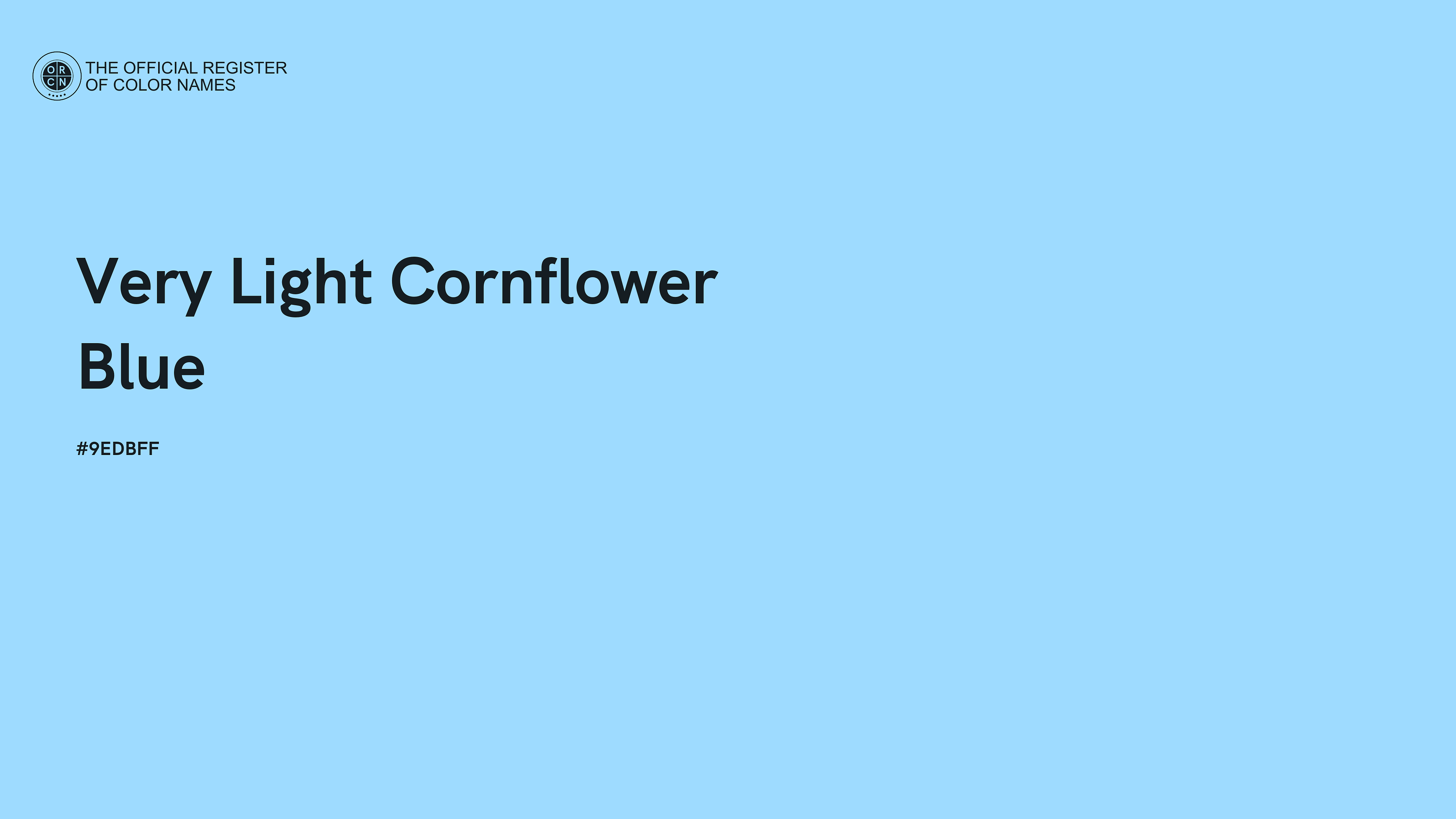 The digital color HEX #9EDBFF, known as "Very Light Cornflower Blue", belongs to the Azure Color Family featuring Full Saturation (Saturation Family) and Very Light (Brightness Family).