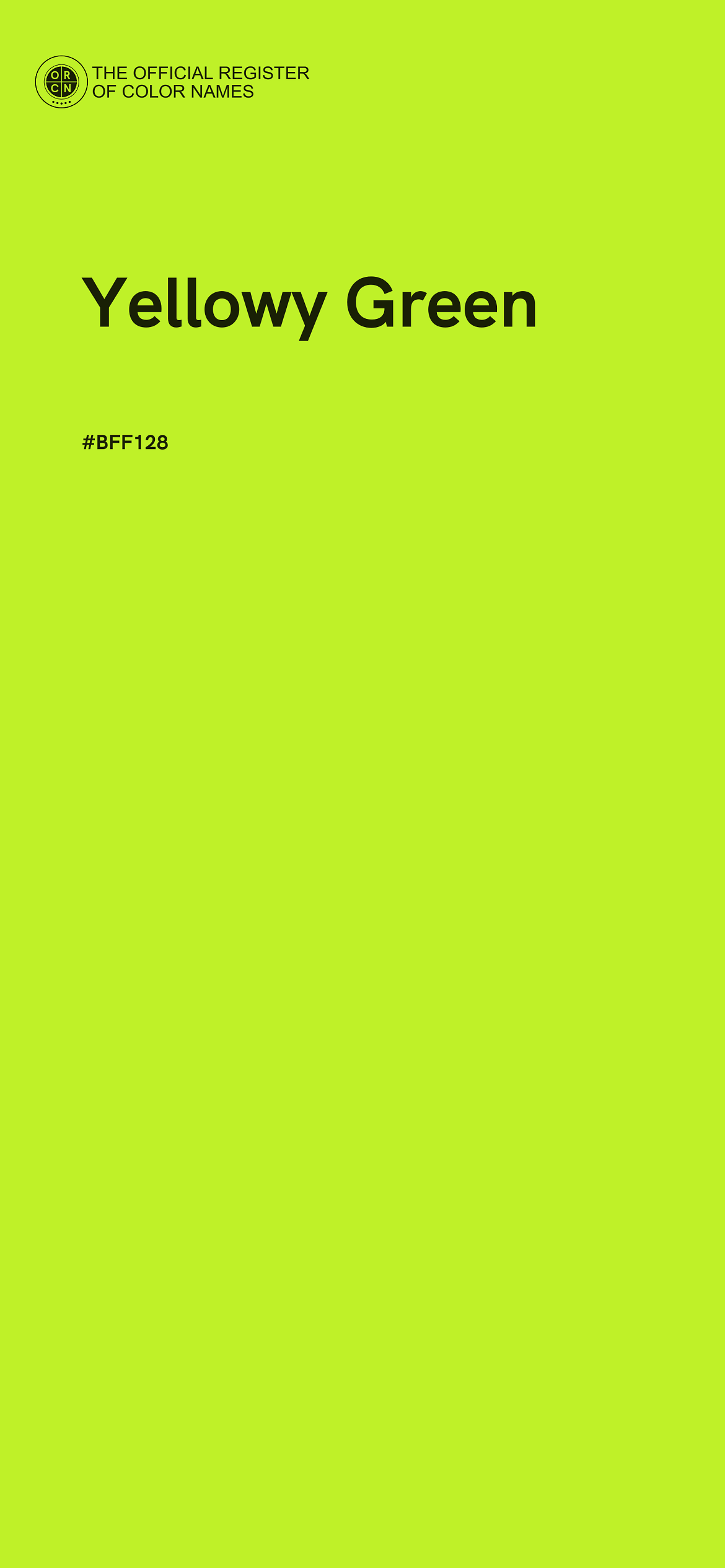 The digital color HEX #BFF128, known as "Yellowy Green", belongs to the Chartreuse Color Family featuring Full Saturation (Saturation Family) and Light (Brightness Family).