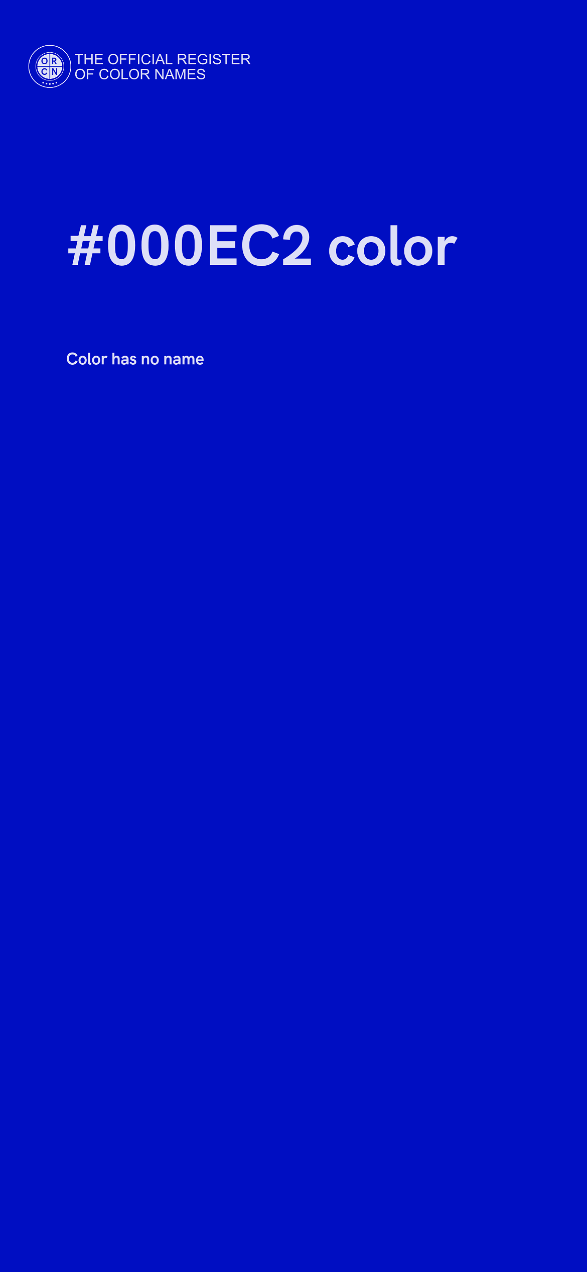 The digital color HEX #000EC2 belongs to the Blue Color Family featuring Full Saturation (Saturation Family) and Neutral (Brightness Family).