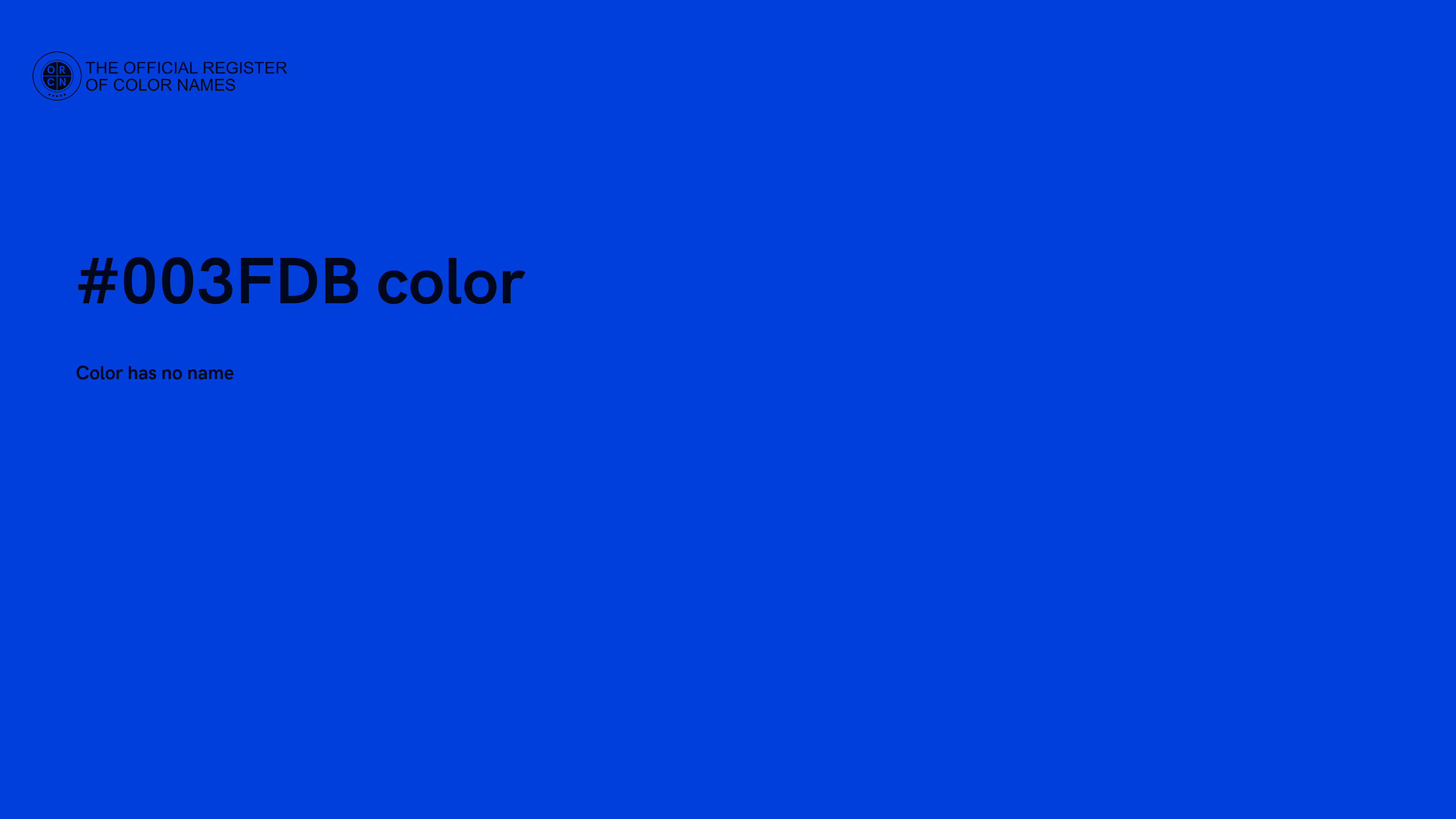 For printing in non digital world, #003FDB is represented in CMYK as 86 Cyan, 61 Magenta, 0 Yellow, and 14 Black (Key) (C:86 M:61 Y:0 K:14).