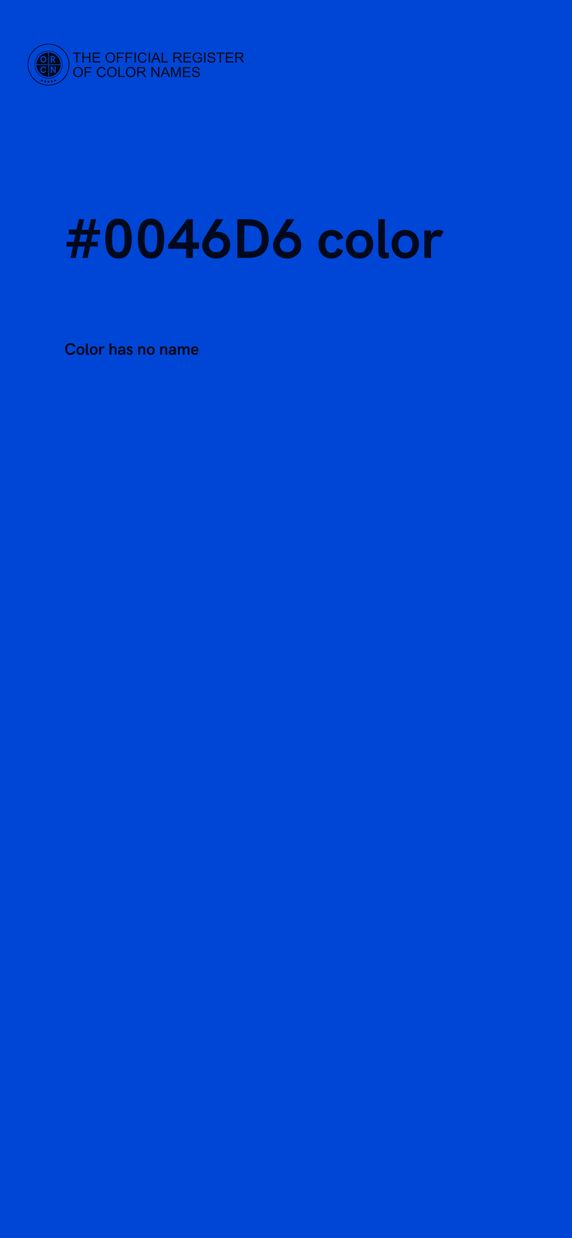 The digital color HEX #0046D6 belongs to the Azure Color Family featuring Full Saturation (Saturation Family) and Light (Brightness Family).