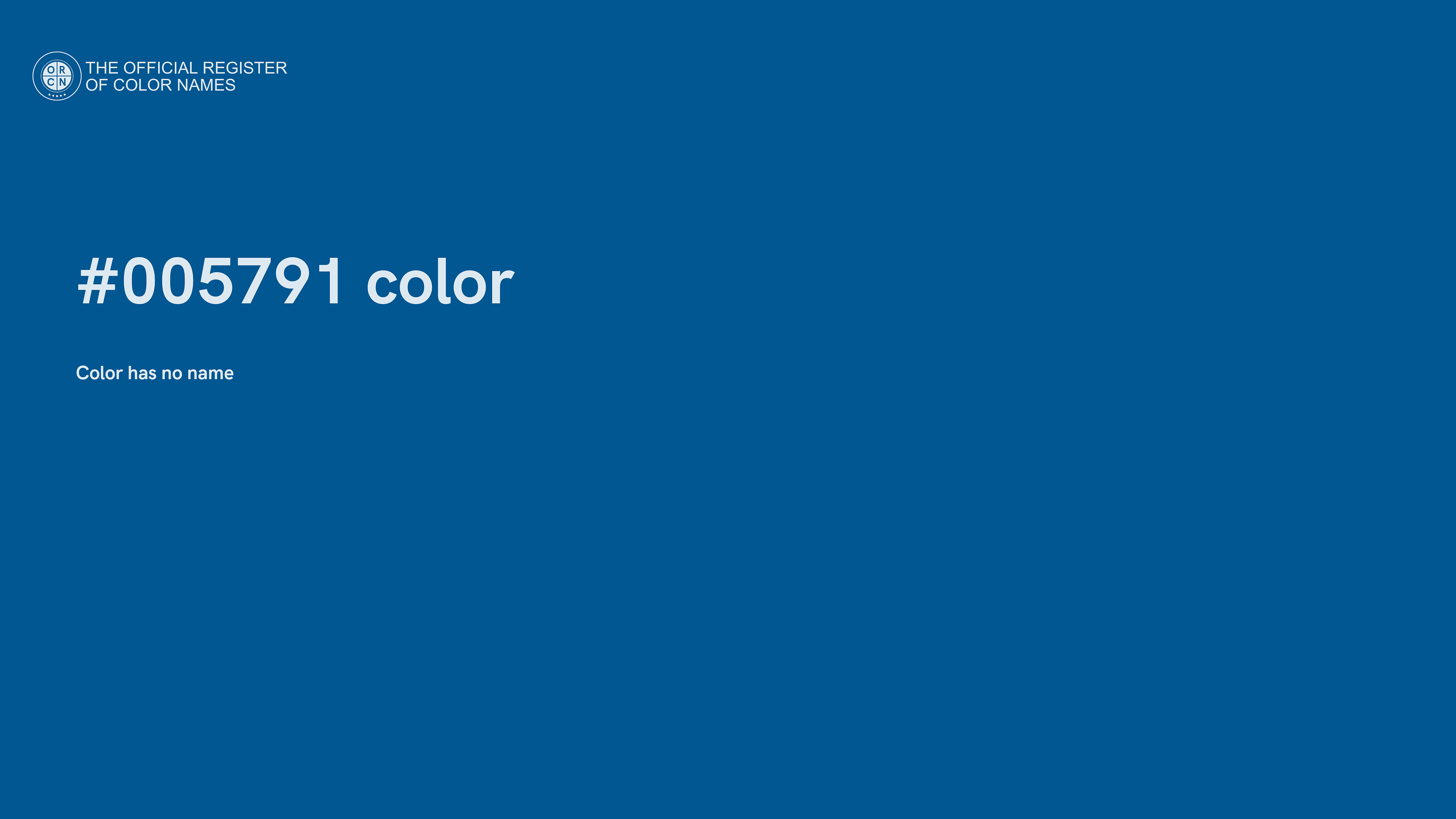 The digital color HEX #005791 belongs to the Azure Color Family featuring Full Saturation (Saturation Family) and Neutral (Brightness Family).