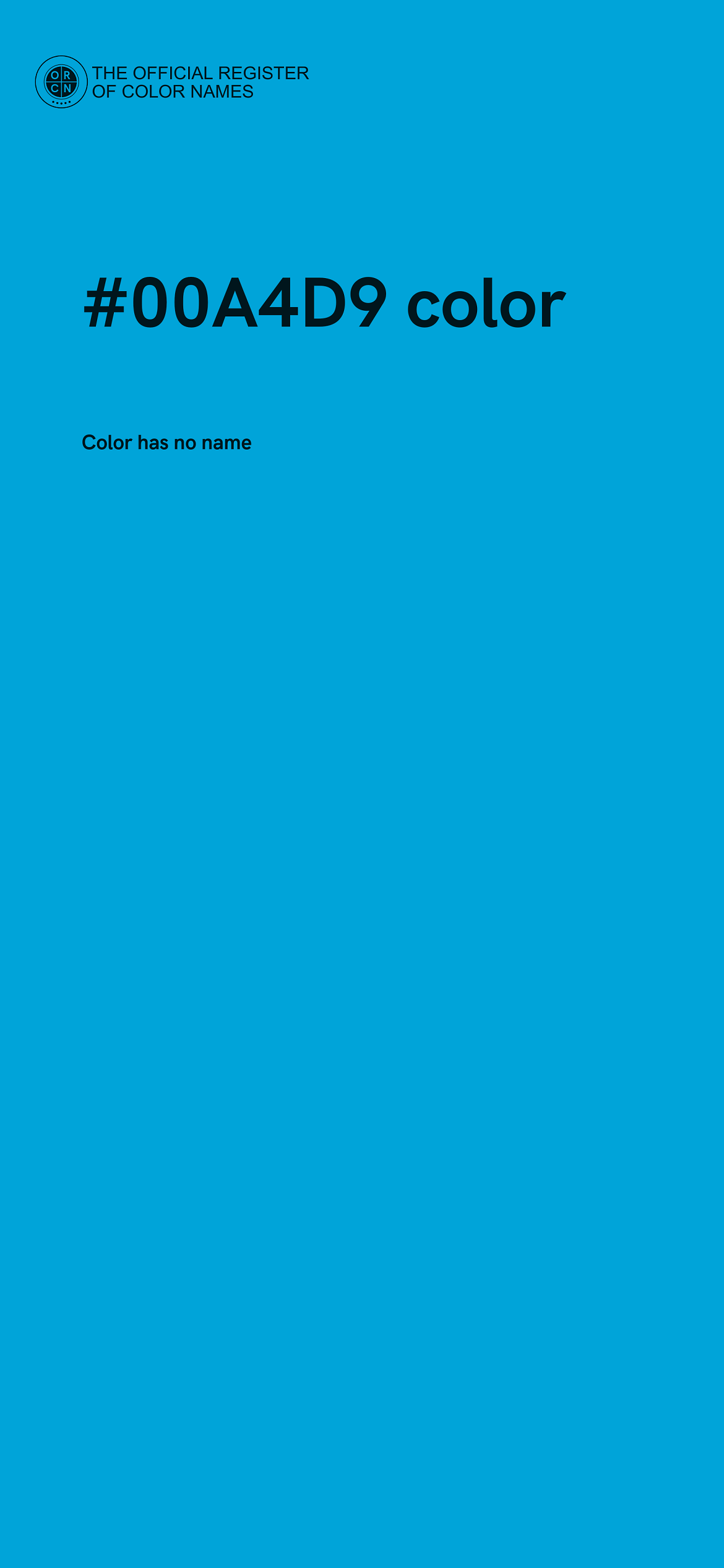 The digital color HEX #00A4D9 belongs to the Azure Color Family featuring Full Saturation (Saturation Family) and Light (Brightness Family).