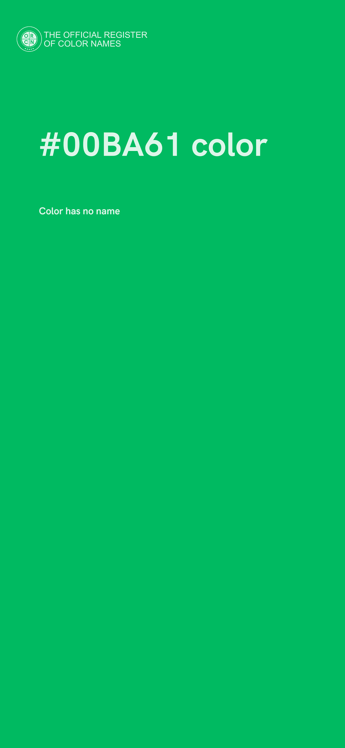 The digital color HEX #00BA61 belongs to the Spring Green Color Family featuring Full Saturation (Saturation Family) and Neutral (Brightness Family).