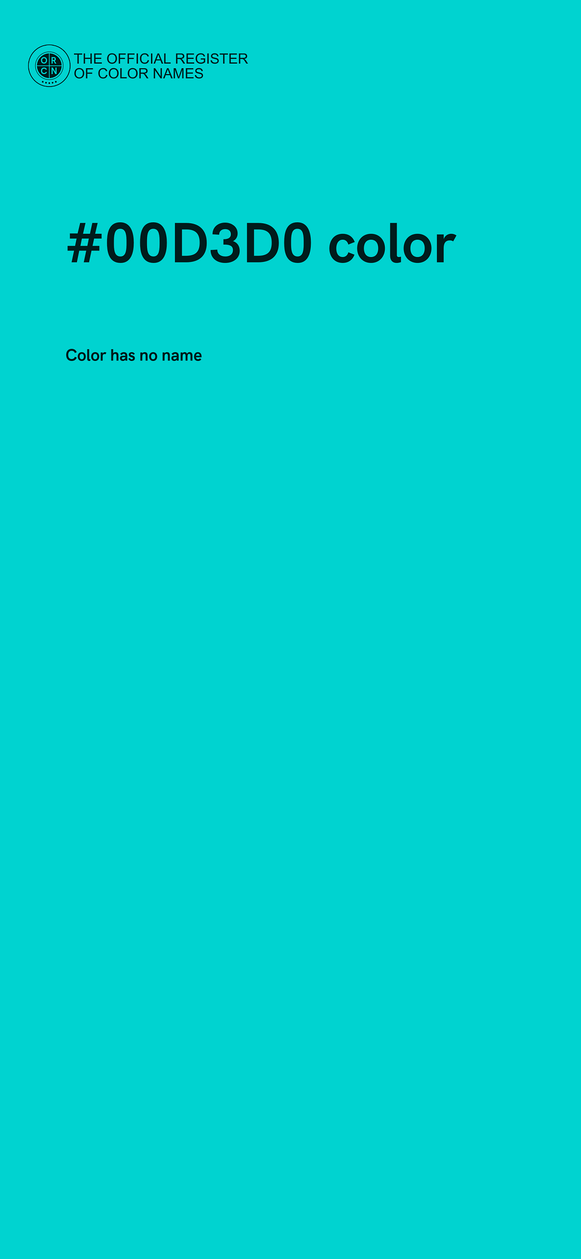 The digital color HEX #00D3D0 belongs to the Cyan Color Family featuring Full Saturation (Saturation Family) and Light (Brightness Family).