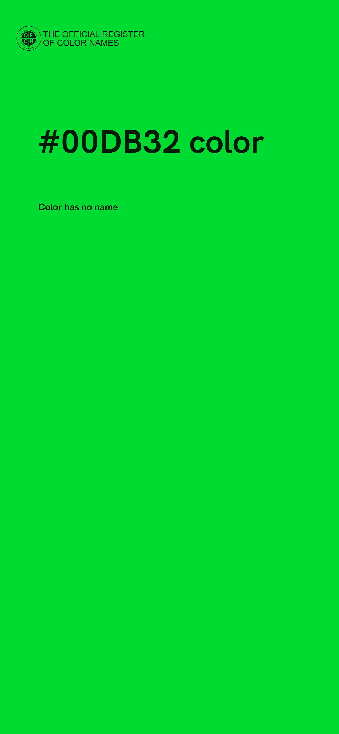 The digital color HEX #00DB32 belongs to the Green Color Family featuring Full Saturation (Saturation Family) and Light (Brightness Family).