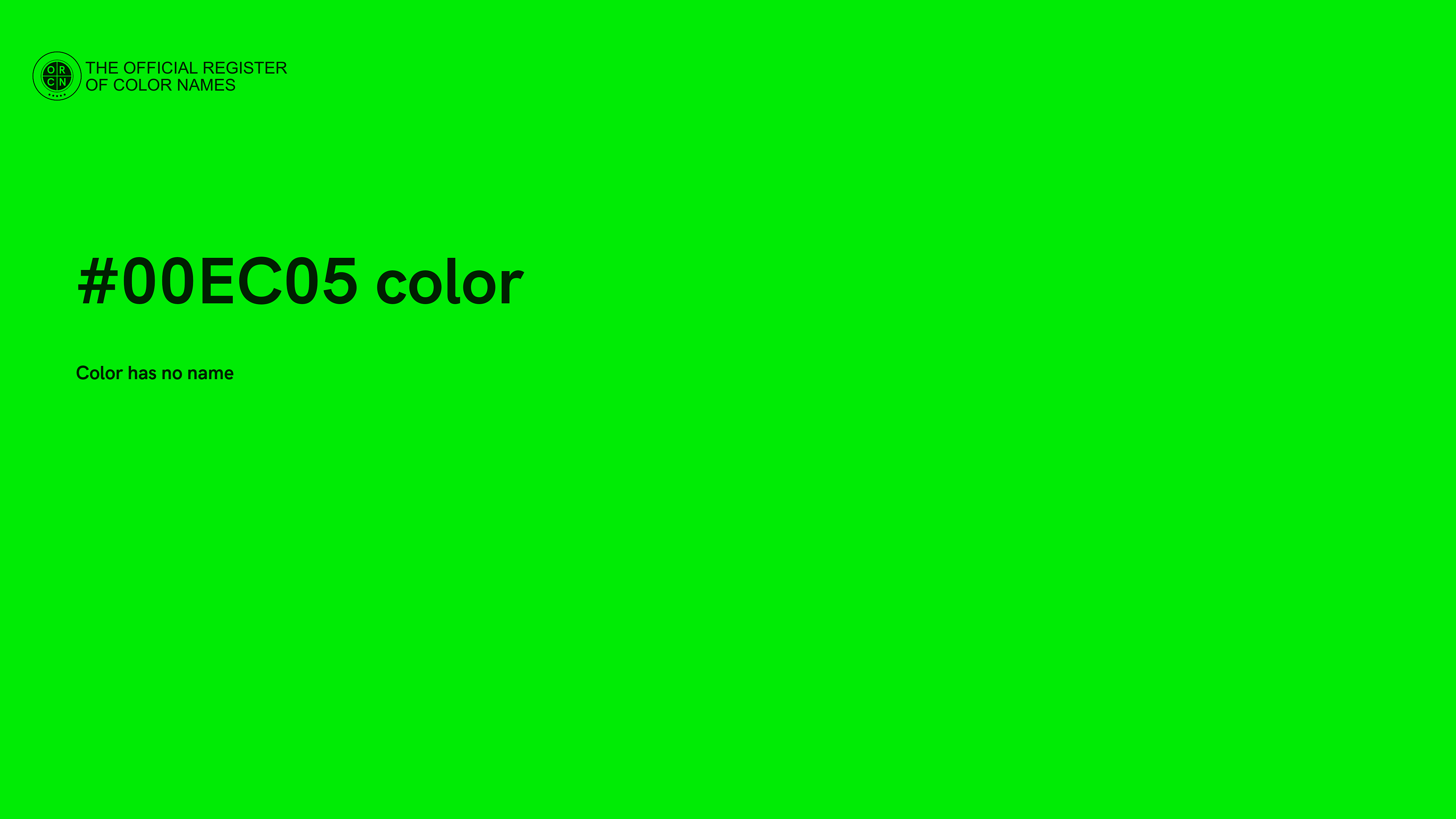 The digital color HEX #00EC05 belongs to the Green Color Family featuring Full Saturation (Saturation Family) and Light (Brightness Family).