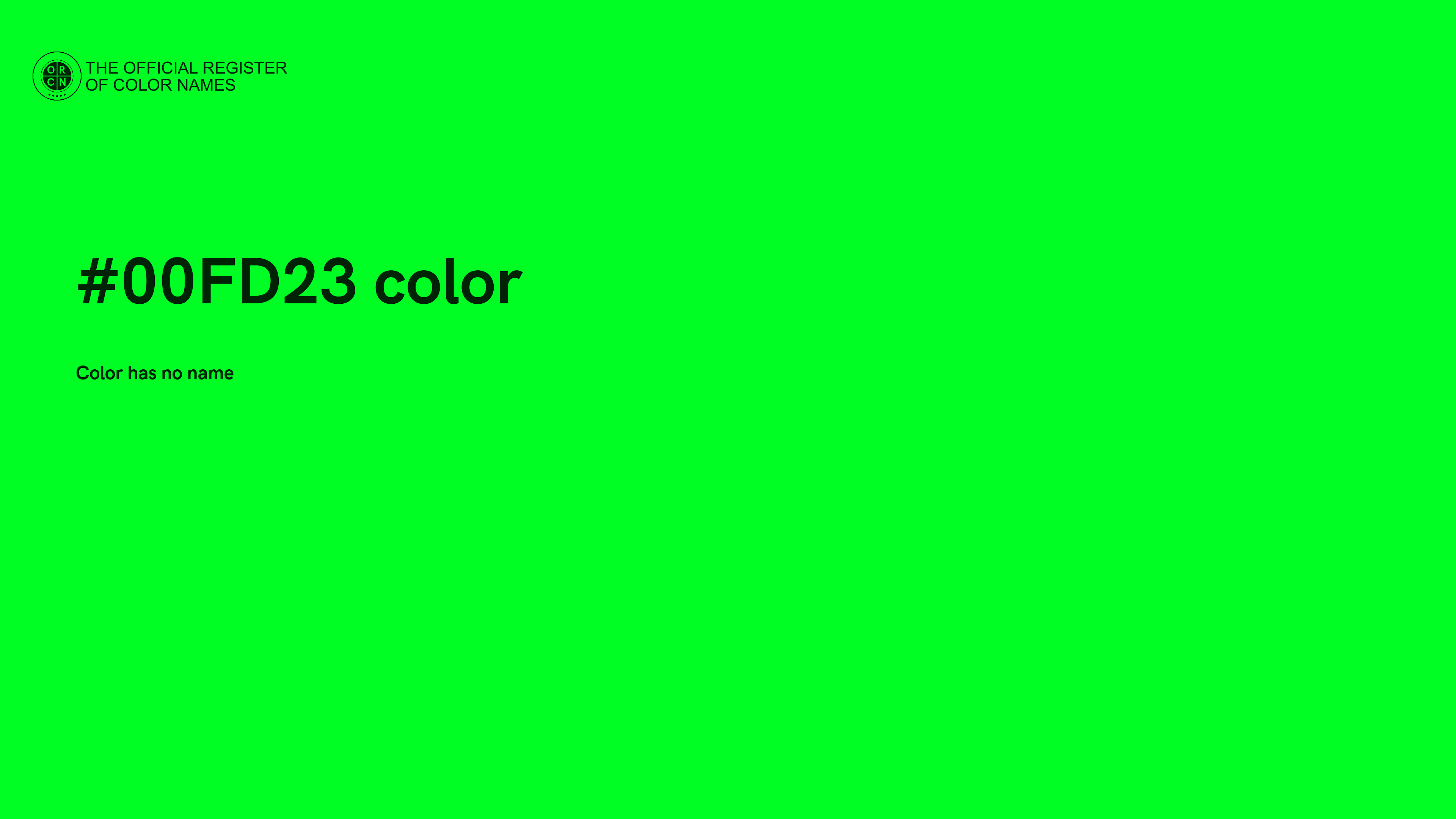 The digital color HEX #00FD23 belongs to the Green Color Family featuring Full Saturation (Saturation Family) and Light (Brightness Family).